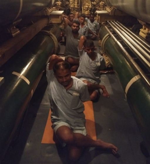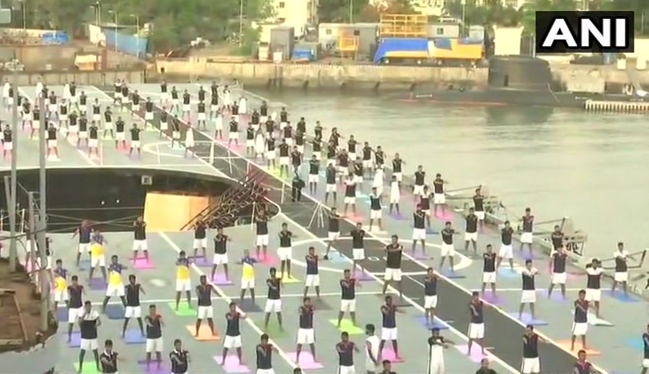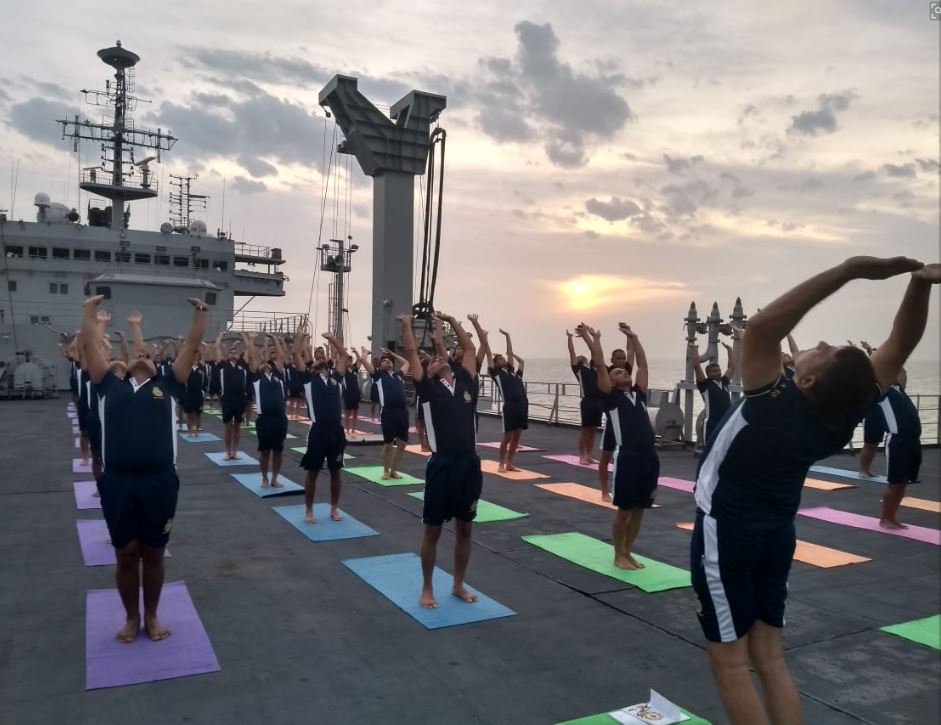 Eastern naval command staff performed yoga on board INS Jyothi in Bay of Bengal off Visakhapatnam. The Eastern Naval Command's submarine staff also participated in the International Yoga Day.
