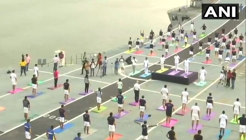 Navy personnel perform Yoga on board INS Virat, which is stationed in Mumbai.