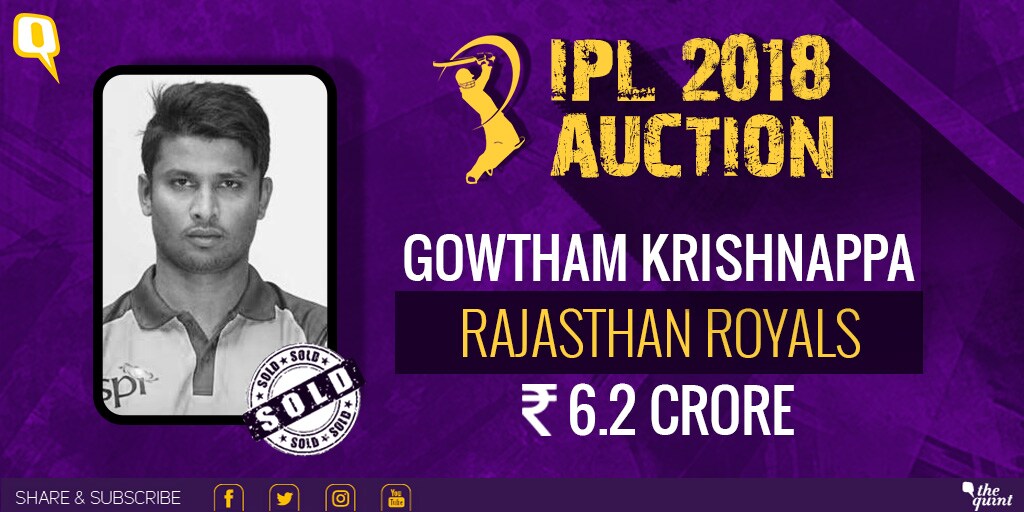 The uncapped off-spinner Krishnappa Gowtham goes to Rajasthan Royals for Rs 6.2 crore. Gowtham has picked up 20 wickets in 27 T20 matches at an average of 28.95.