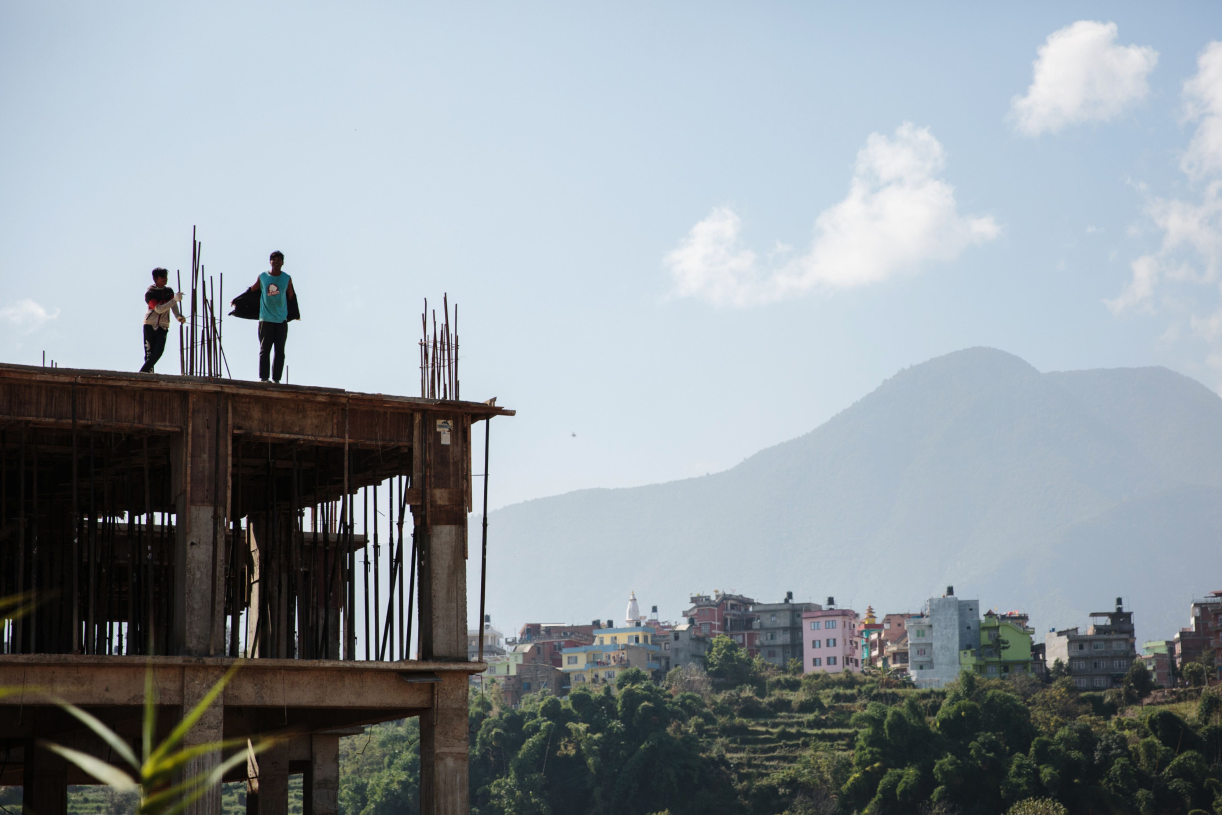 Workers stand on the roof of a commercial building under construction in Kathmandu, Nepal. (Photographer: Sara Hylton/Bloomberg)