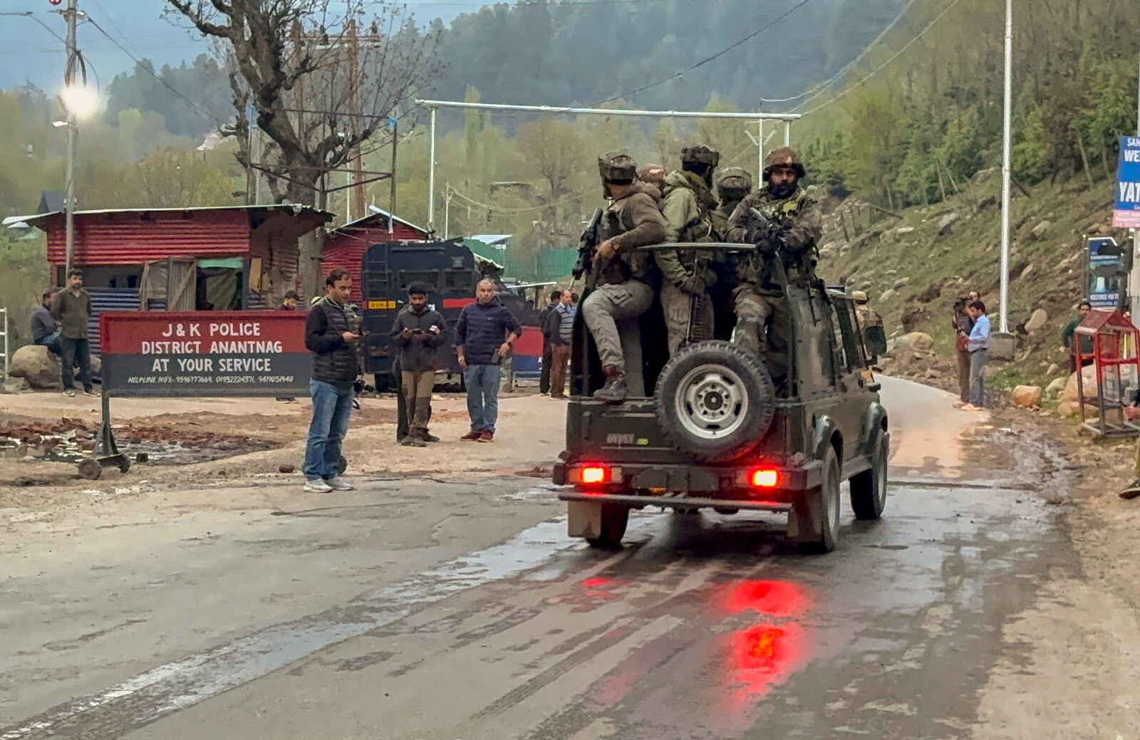 Security personnel stand guard after terrorists attacked a group of tourists at Pahalgam, in Anantnag district, Jammu & Kashmir, Tuesday, April 22, 2025. (Photo source: PTI)