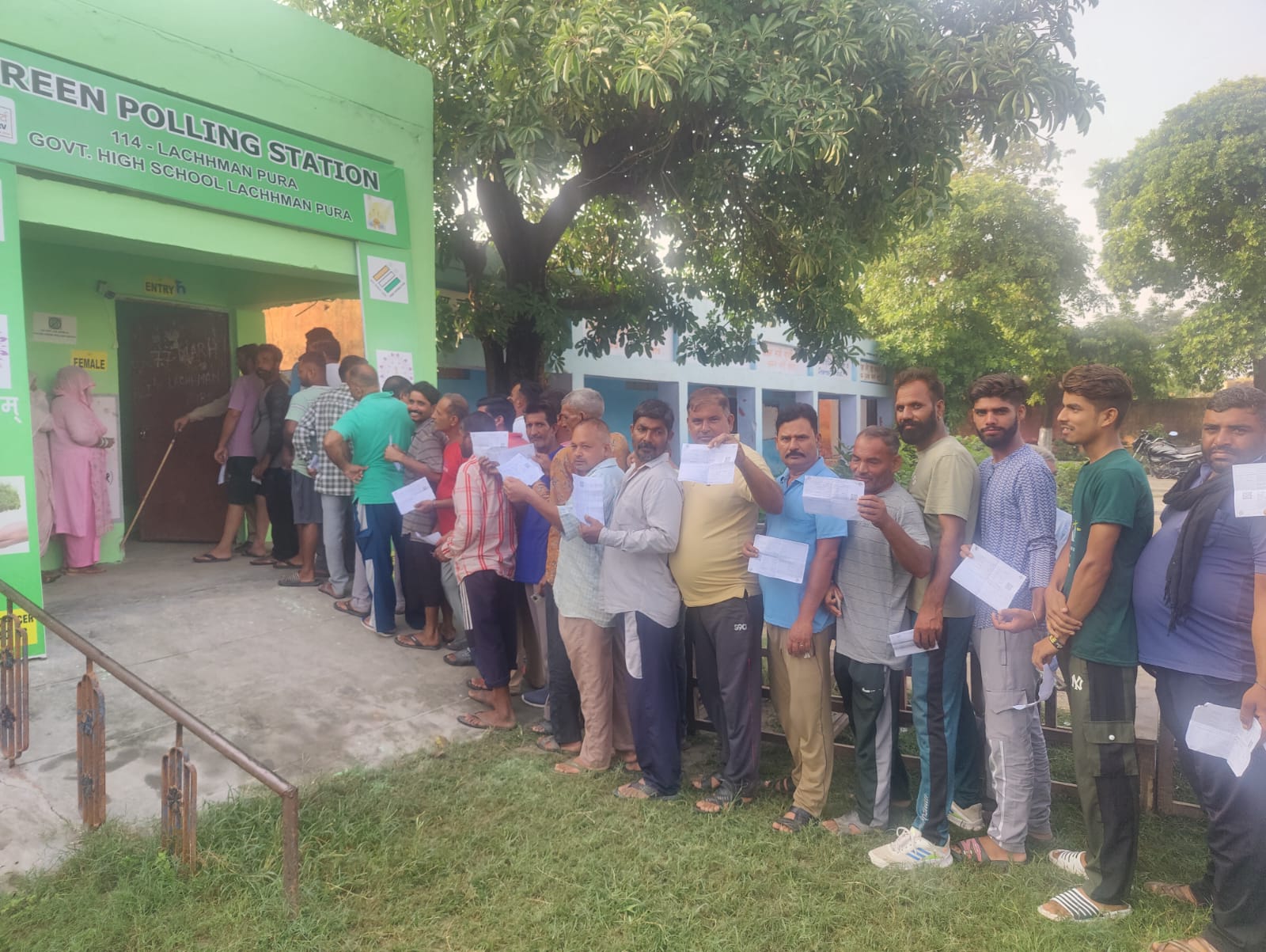 Voters line up to cast their vote at Green Polling Station Lachhman Pura in Marh Assembly Constituency before clicking selfies to make the day even more memorable. (Source: District Magistrate, Jammu)
