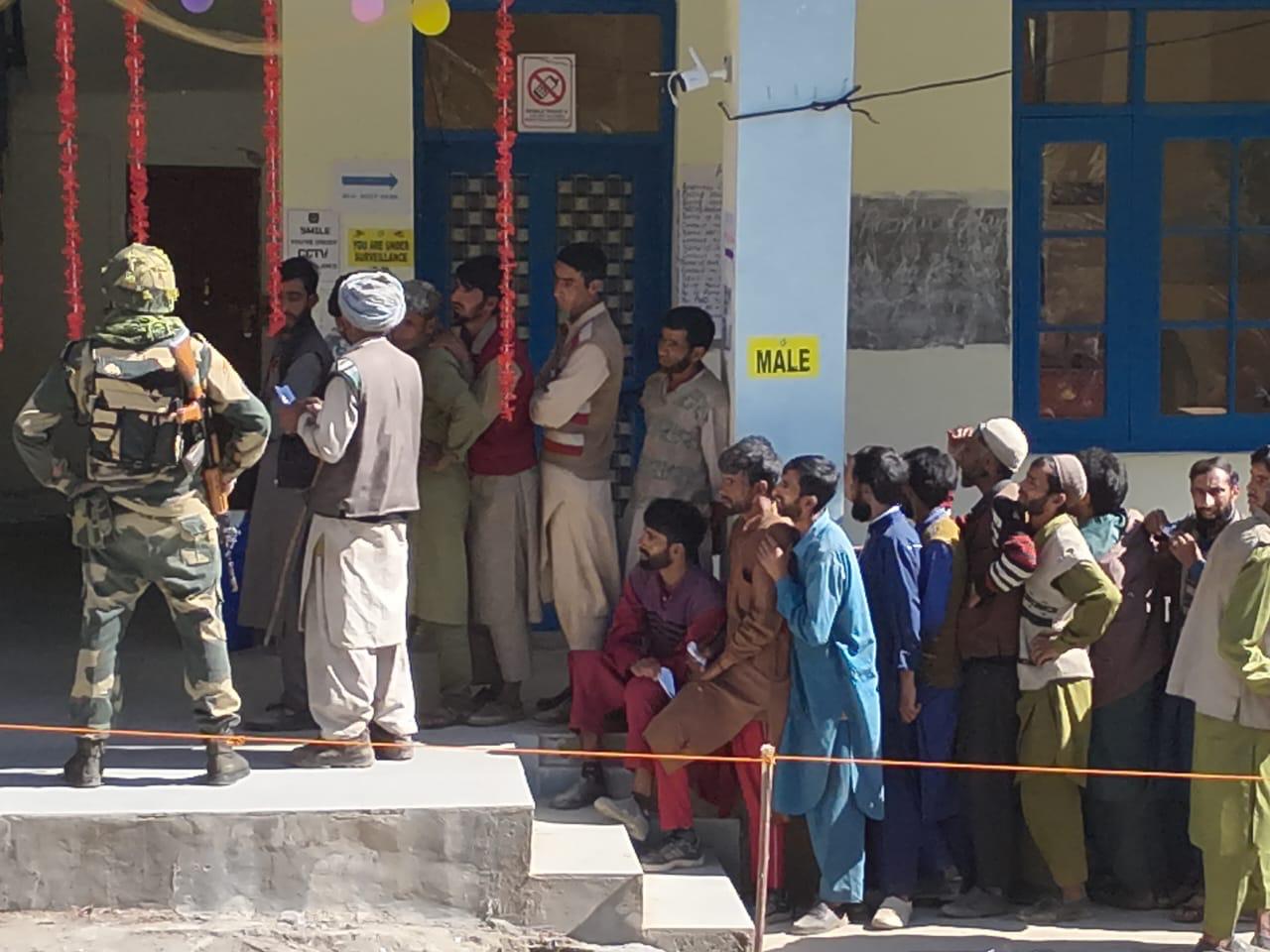 Voters line up to cast their vote at Green Polling Station Lachhman Pura in Marh Assembly Constituency before clicking selfies to make the day even more memorable. (Source: District Magistrate, Jammu)