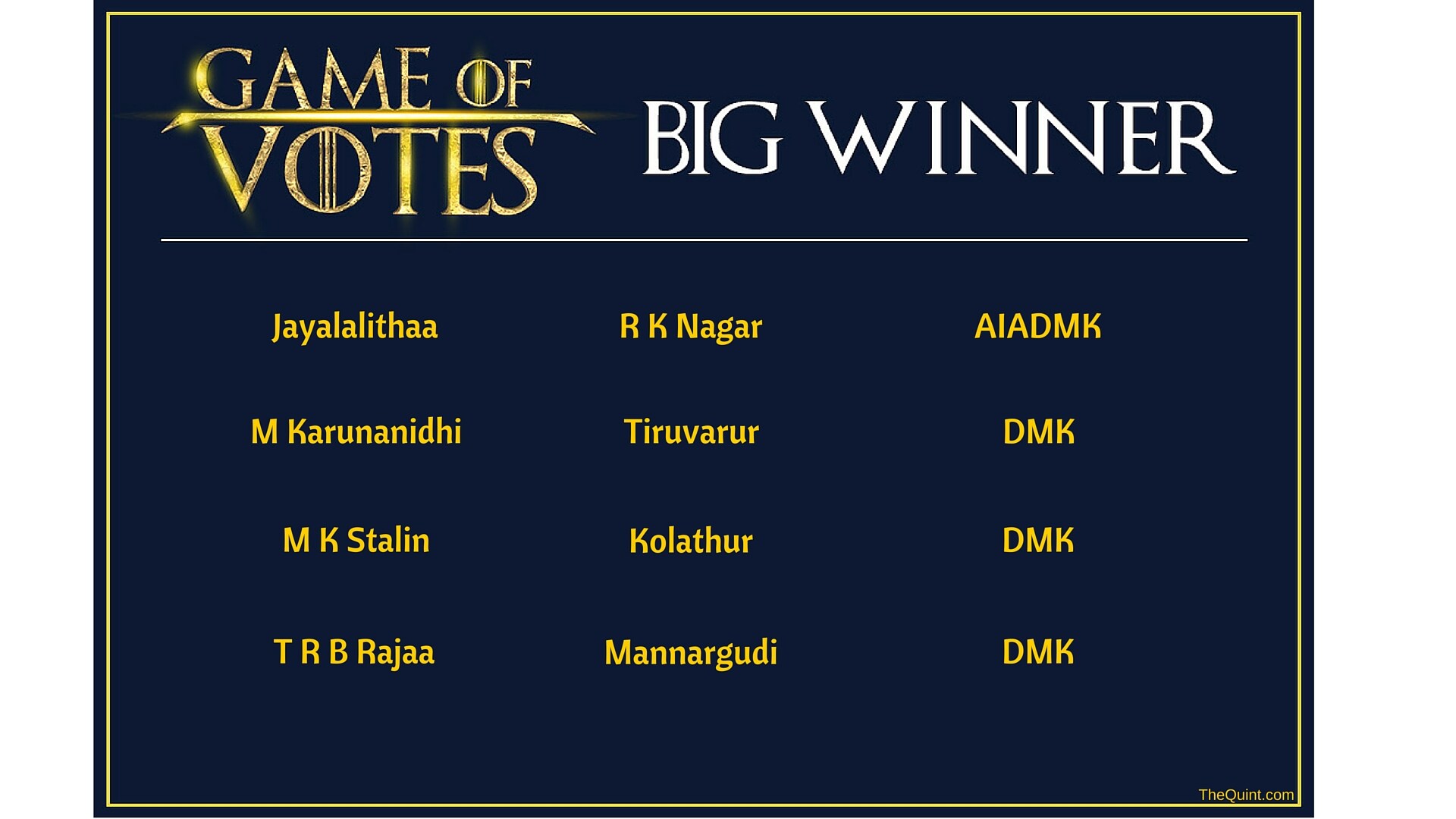 DMK President M Karunanidhi won the seat of Tiruvarur from where he was contesting. Actor Vijayakanth's DMDK failed to make an impression on the voters as he did not get a single seat in the elections.