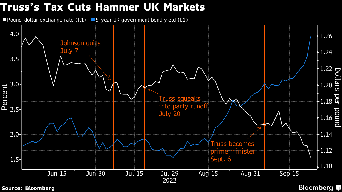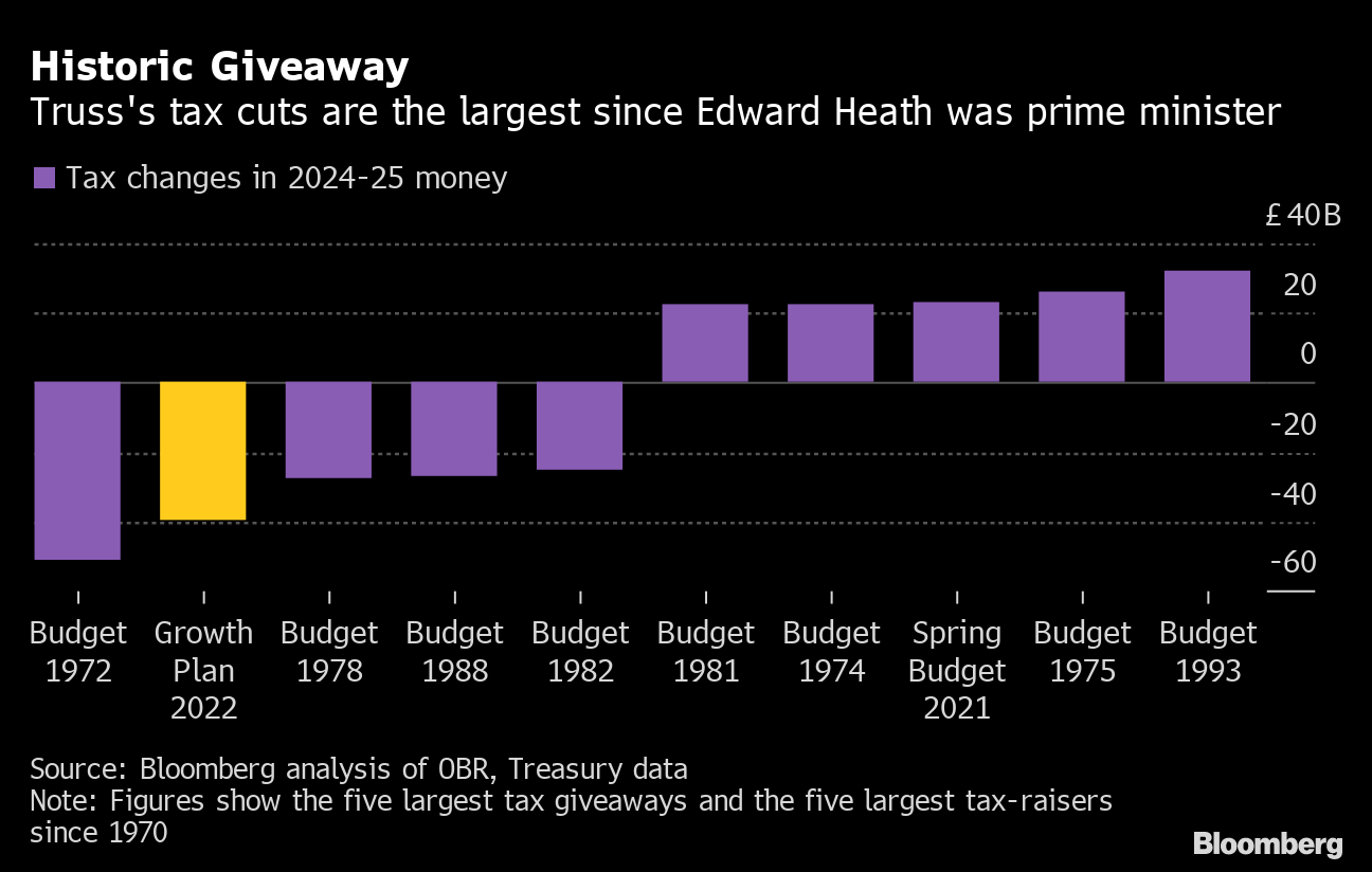 (Bloomberg) -- Liz Truss's plan for growth, melding the biggest tax giveaway in half a century with Thatcherite deregulation, is a straight-up gamble with Britain's future, and even before her chancellor of the exchequer had finished delivering it on Friday the bet was starting to sour.