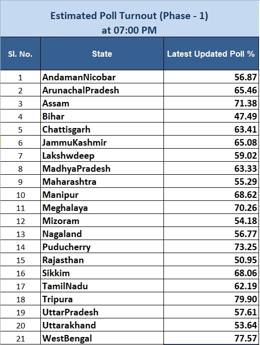 Tentative figure of voter turnout across 21 States/UTs reported is over 60% at 7 PM, the Election Commission said. The voting percentage is likely to go upwards when reports from all polling stations are obtained as polling is scheduled till 6 PM in many constituencies. Final figures will be known on Saturday.