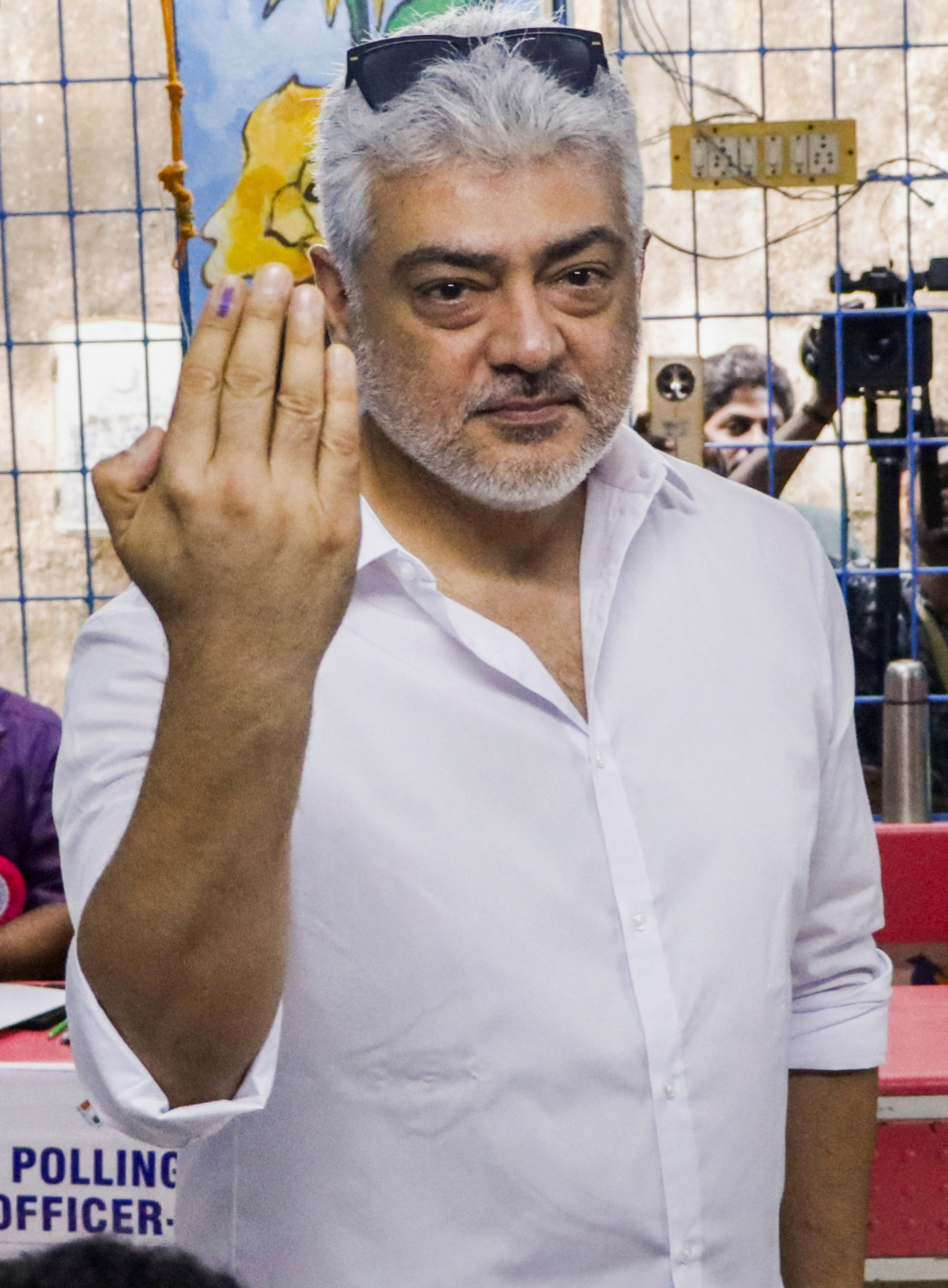Chennai: Actor Ajith Kumar shows his finger marked with indelible ink after casting vote during the first phase of Lok Sabha elections, in Chennai, Friday, April 19, 2024. (PTI Photo)