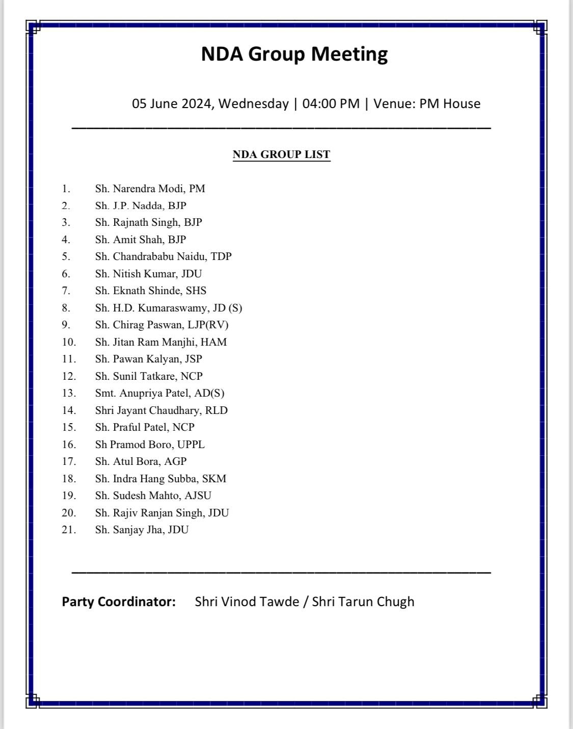 The newly elected leaders of the National Democratic Alliance are set to meet on June 7th at 11:00 a.m. in the Central Hall of Parliament in Delhi, according to ANI. The NDA had secured 293 seats in the Lok Sabha elections, and are set to form the new government.