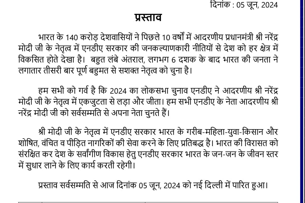 "We are all proud that the NDA fought the 2024 Lok Sabha polls unitedly under the leadership of Prime Minister Narendra Modi and won. We all NDA leaders unanimously elect Narendra Modi as our leader," it added.