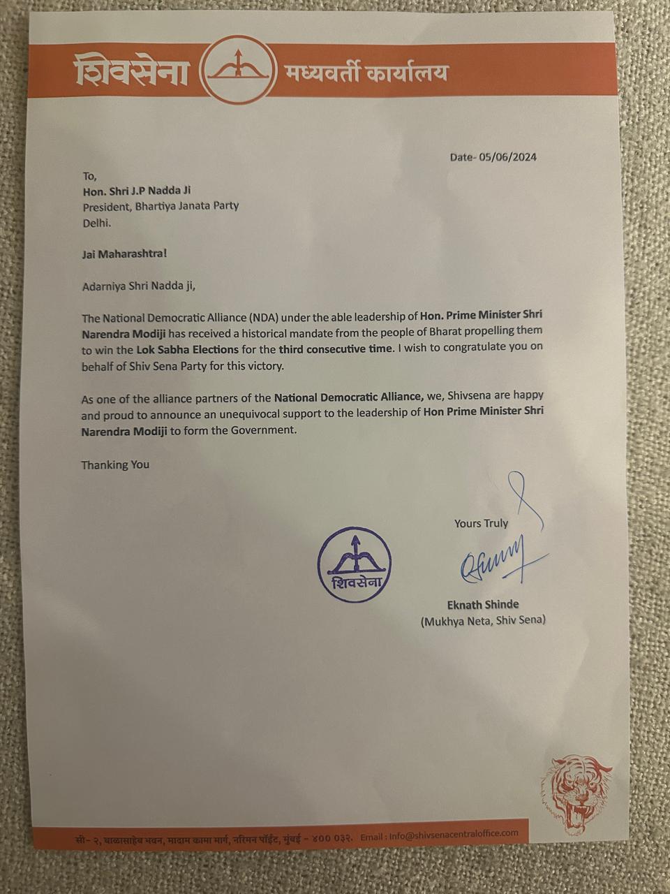 Shiv Sena handed over its letter of support to BJP president JP Nadda to form and NDA government under PM Narendra Modi. The Eknath Shinde-led party won 8 seats in Lok Sabha elections.
