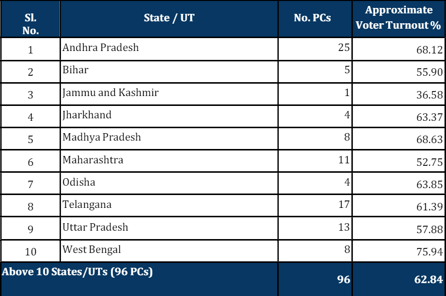 The voter turnout crossed 50% in six states, including Andhra Pradesh (55.5%), Jharkhand (56.4%), Madhya Pradesh (59.6%), Odisha (52.9%), and West Bengal (66.1%).