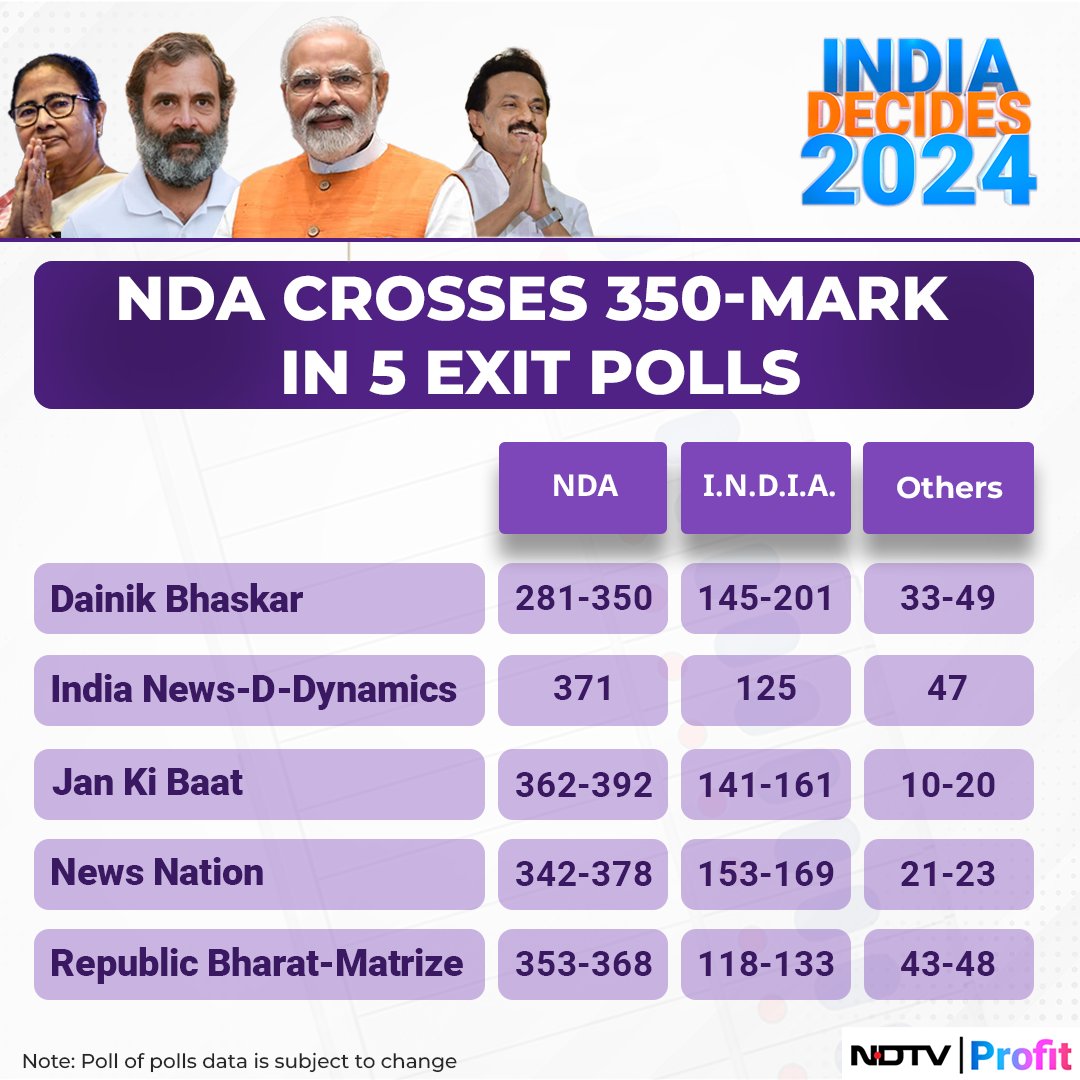 The opposition INDIA bloc is expected to win under 150 seats, as per exit polls.