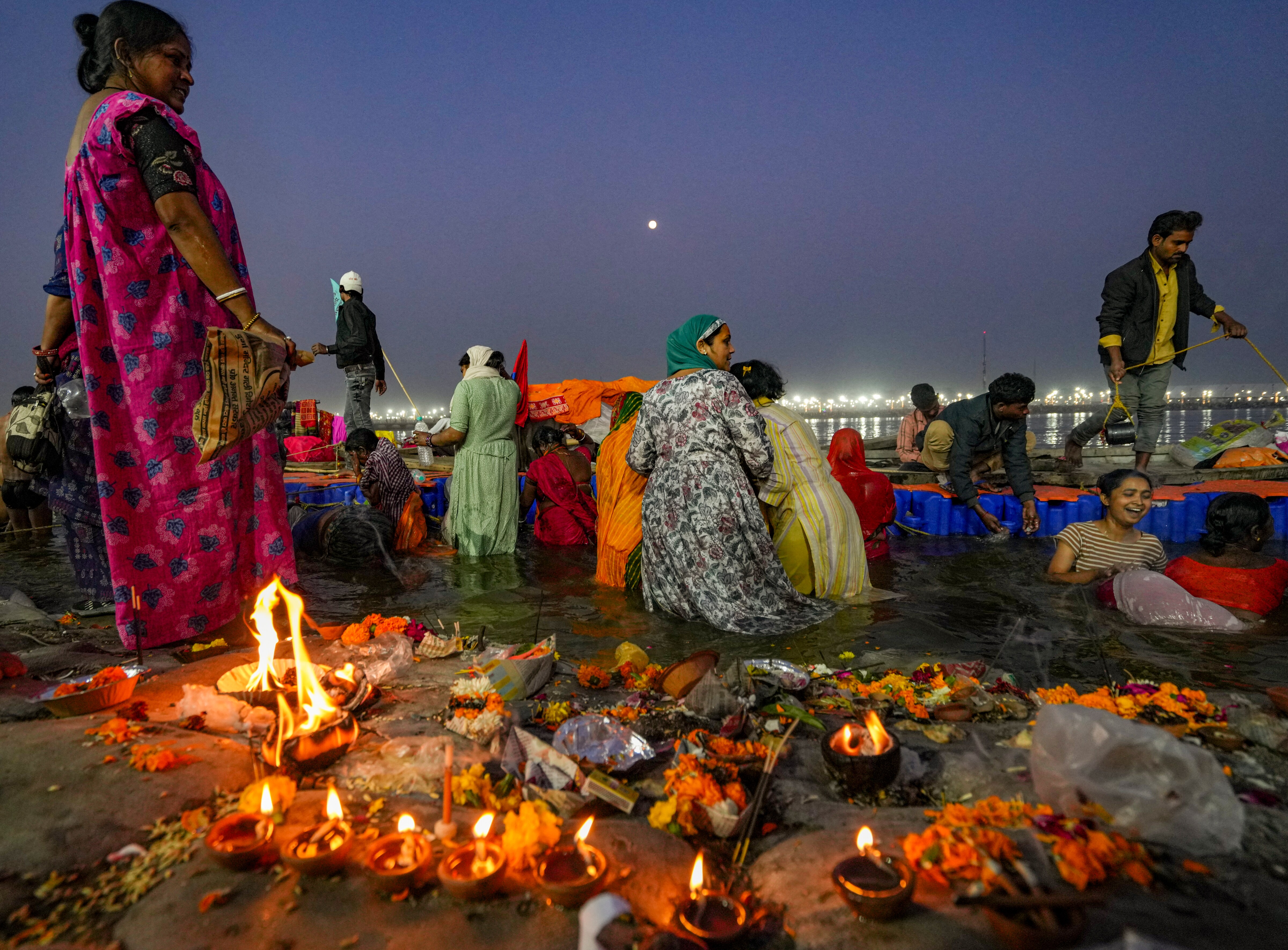 Prayagraj: Devotees take a holy dip on the eve of 'Maghi Purnima', during the ongoing Mahakumbh Mela, in Prayagraj, Uttar Pradesh, Tuesday, Feb. 11, 2025. (PTI Photo/Shahbaz Khan)