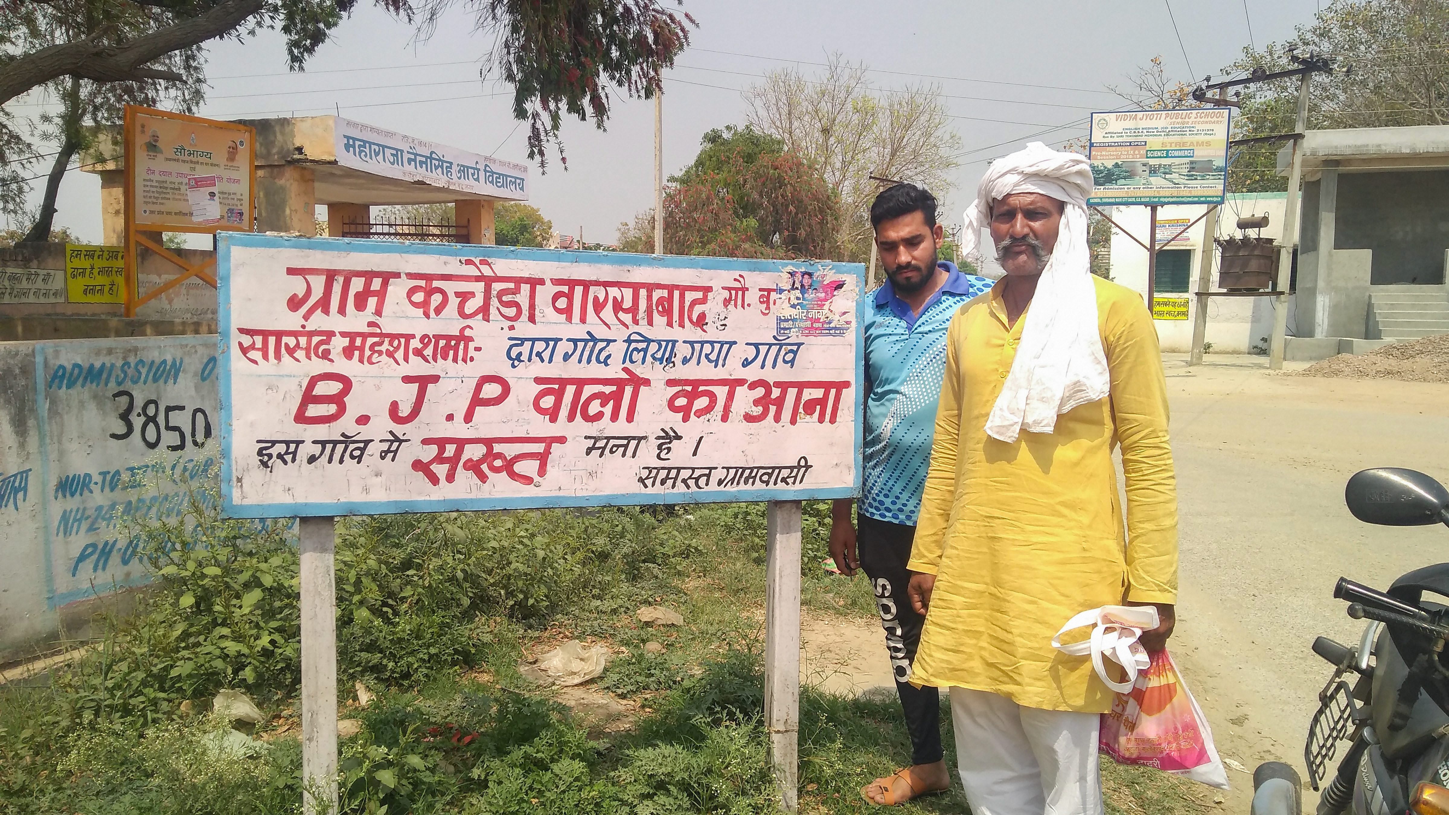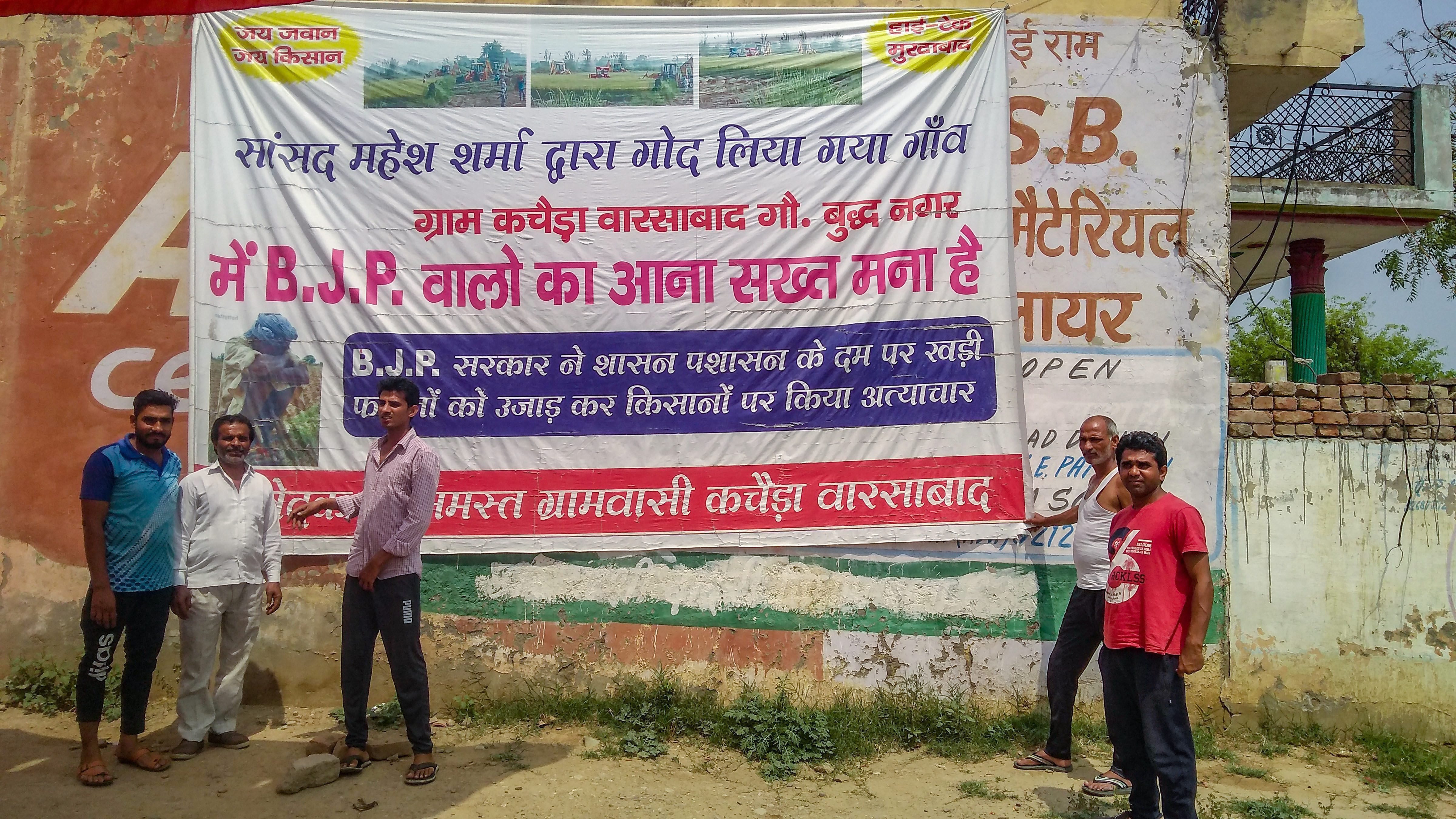 A poster, declaring, Kachera Varsabad, Mahesh Sharma ke god liye gaon mein BJP walon ka aana sakhta mana hai (This is Kachera, the village adopted by Mahesh Sharma. The BJP's people are not allowed in here) hangs on a wall near their protest site, and similar signage can be seen at various entry points of the village.