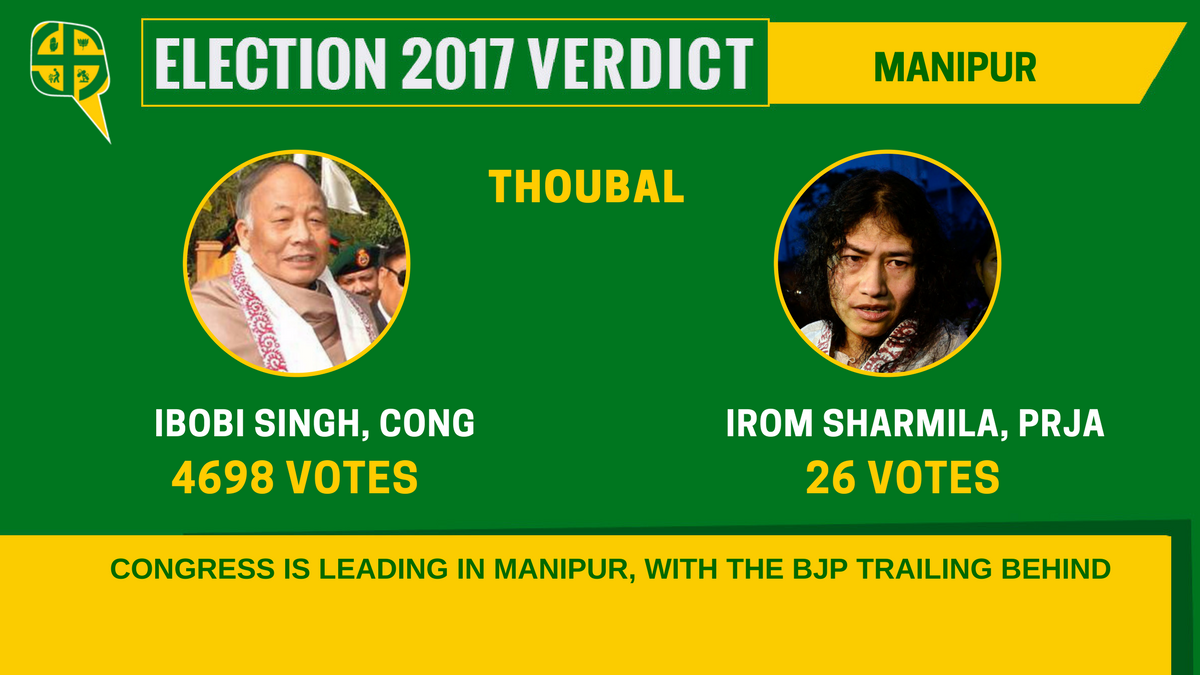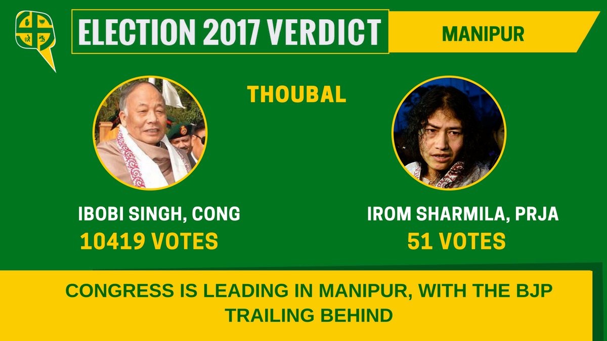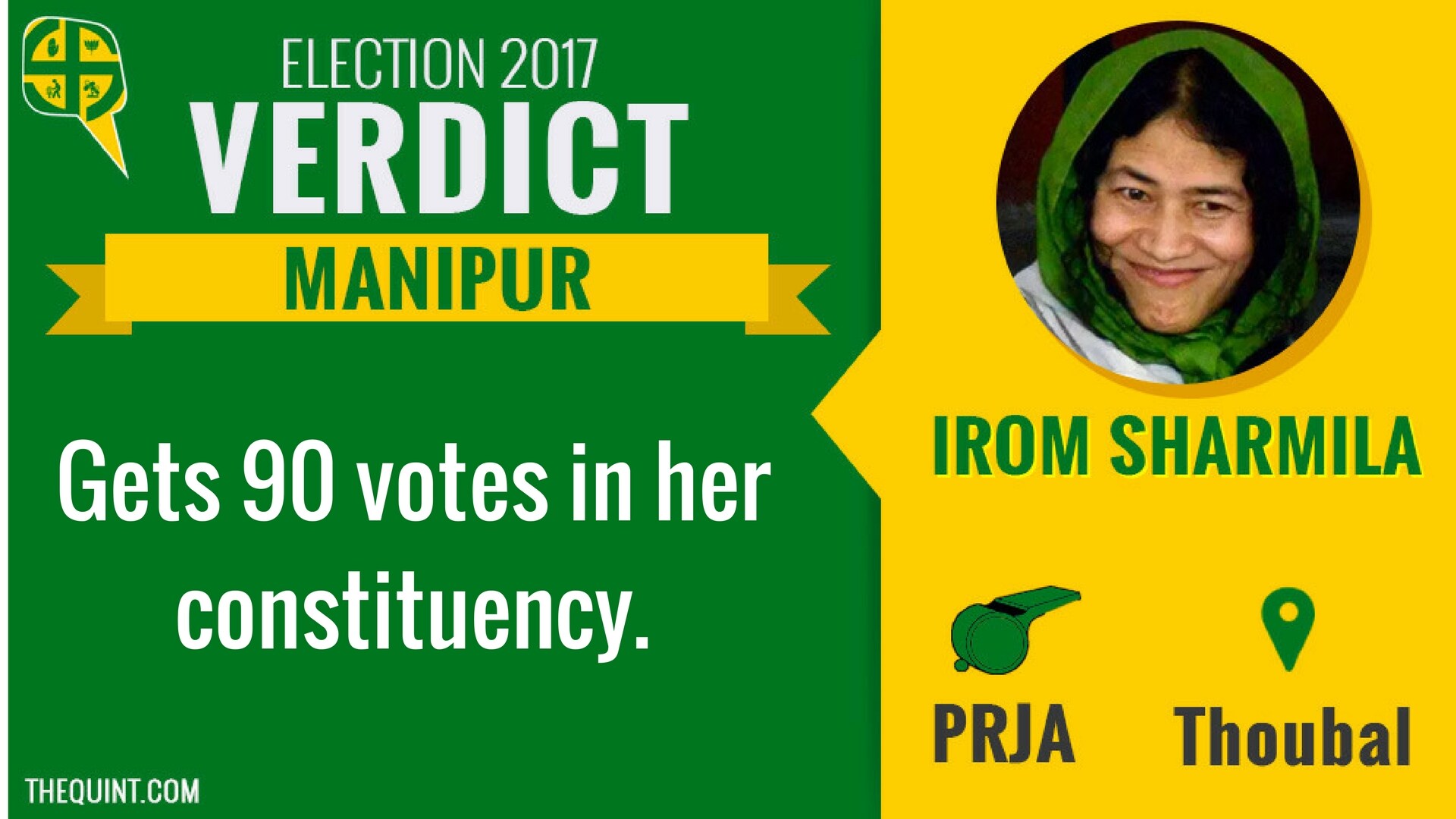 In a huge blow to activist-turned-politician, Irom Sharmila garnered only 90 votes and lost to CM Ibobi Singh by a huge margin in Thoubal.