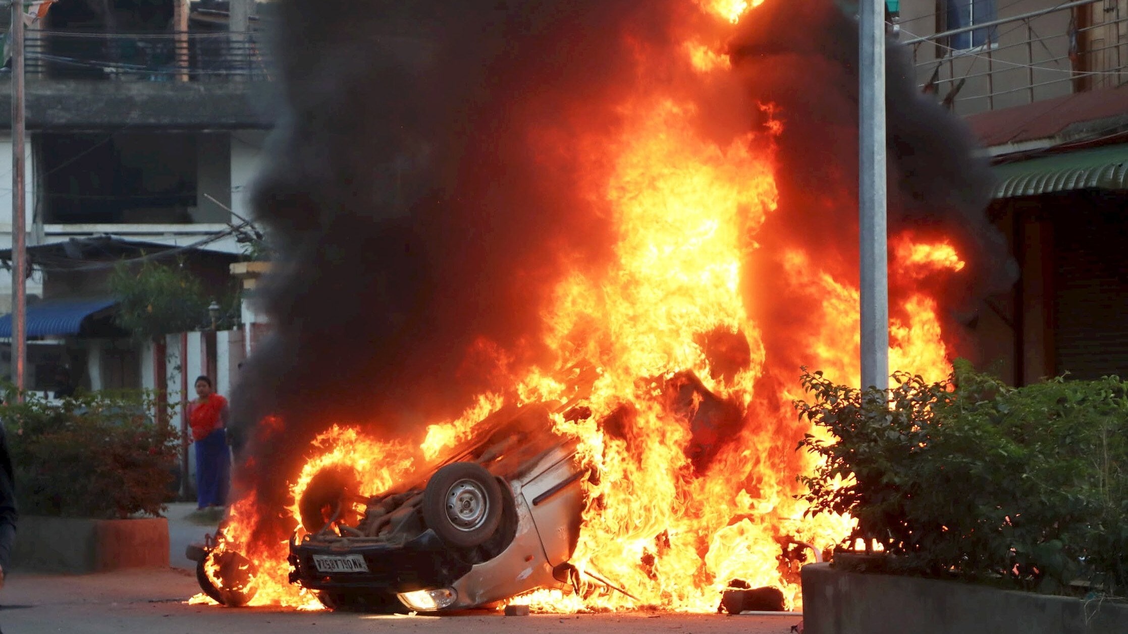 Imphal: Smoke and flames billow out of a car which was set on fire during demonstrations after three bodies, suspected to be of six missing persons from Jiribam district, were found near the Manipur-Assam border on Friday night, in Imphal, Saturday, Nov. 16, 2024. (PTI Photo)