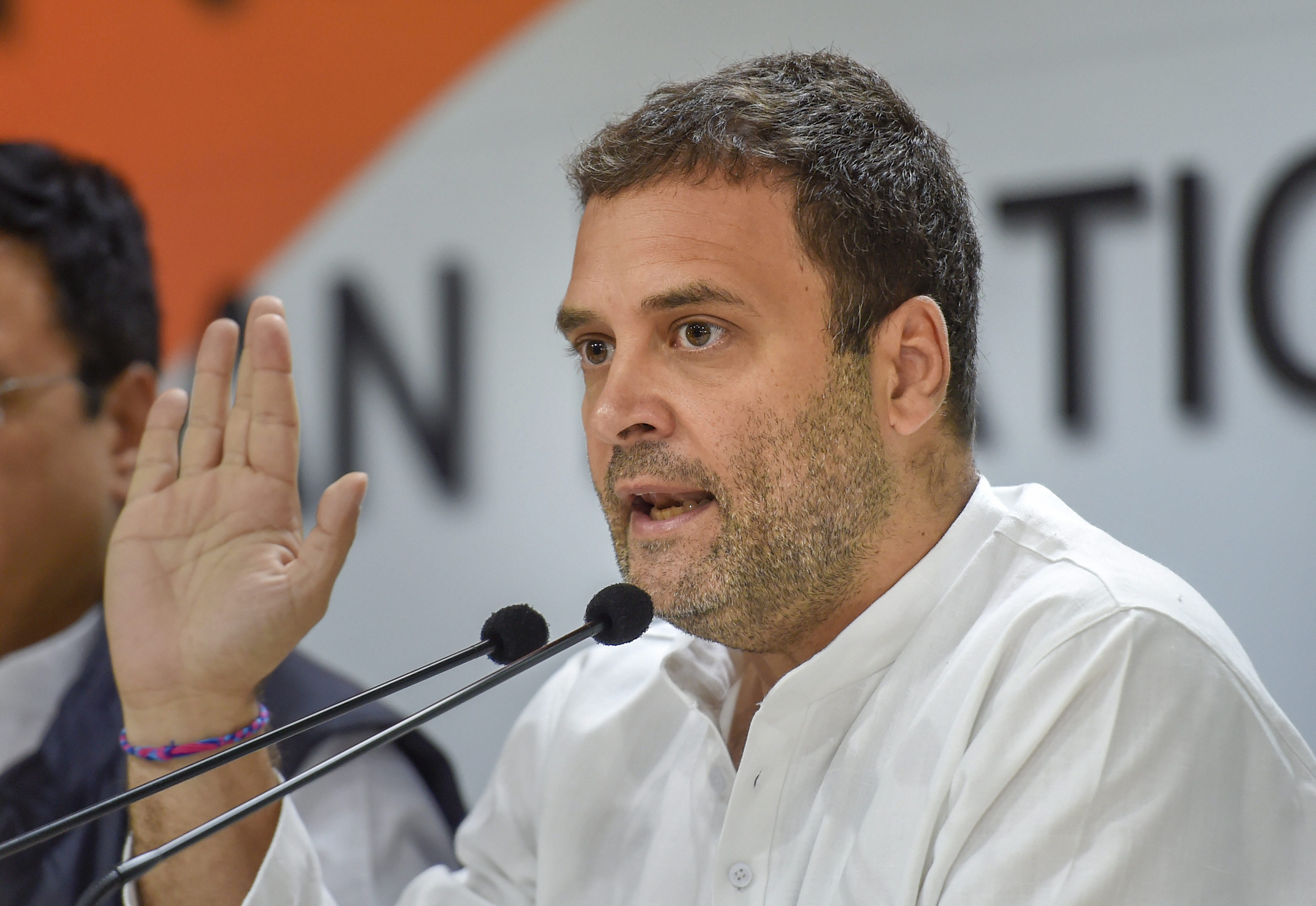 Congress President Rahul Gandhi addresses a press conference at AICC headquarters, in New Delhi. (Source: PTI)