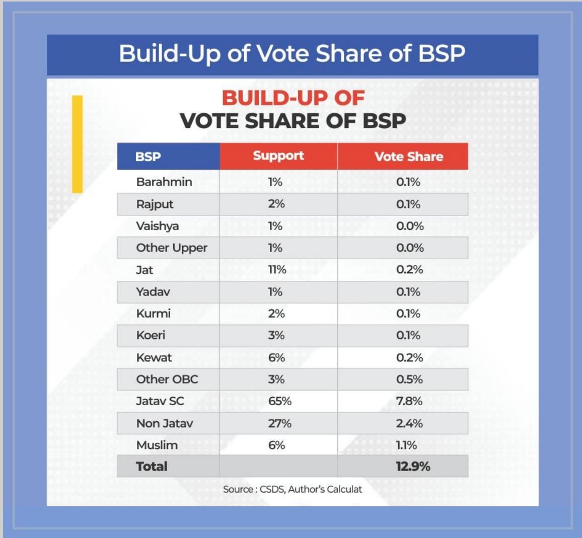 Today, the BSP vote share consists primarily of Jatav and non-Jatav Dalit voters. If the BSP loses more vote share, then more non-Jatavs could move towards the BJP. In the 2022 state elections, the BJP received 51% non-Jatav support as per the Axis My India exit poll.