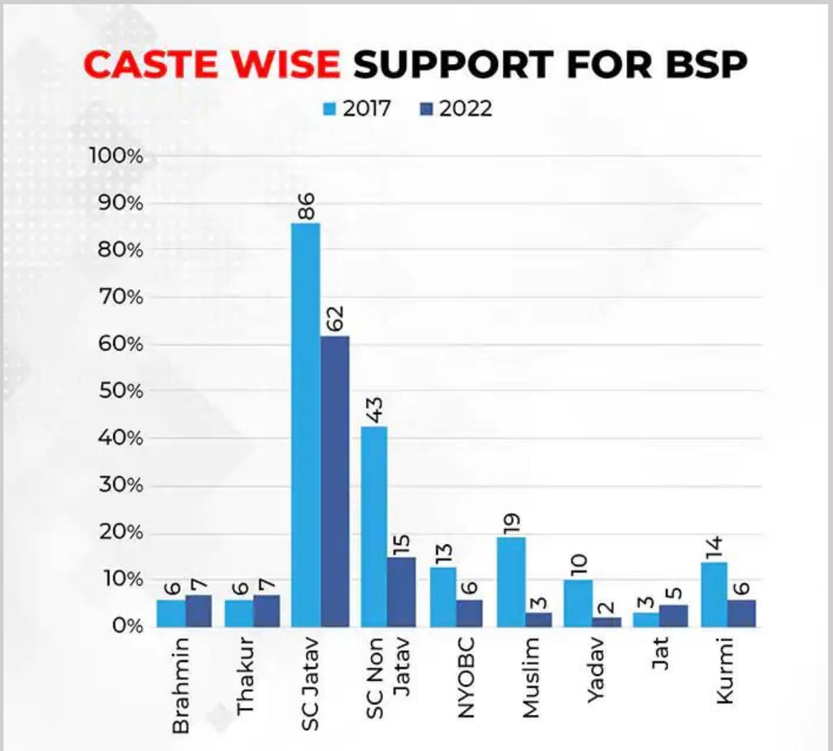 In the 2022 Vidhan Sabha polls, the BSP lost support across major caste groups like Yadavs and Kurmis (-8% each), Muslims (-16%), and non-Yadav OBCs (-13%). What was striking is that it also lost support amongst its key constituents: the Dalits Jatavs (-24%) communities, from which Mayawati hails, and the non-Jatavs (-28%).