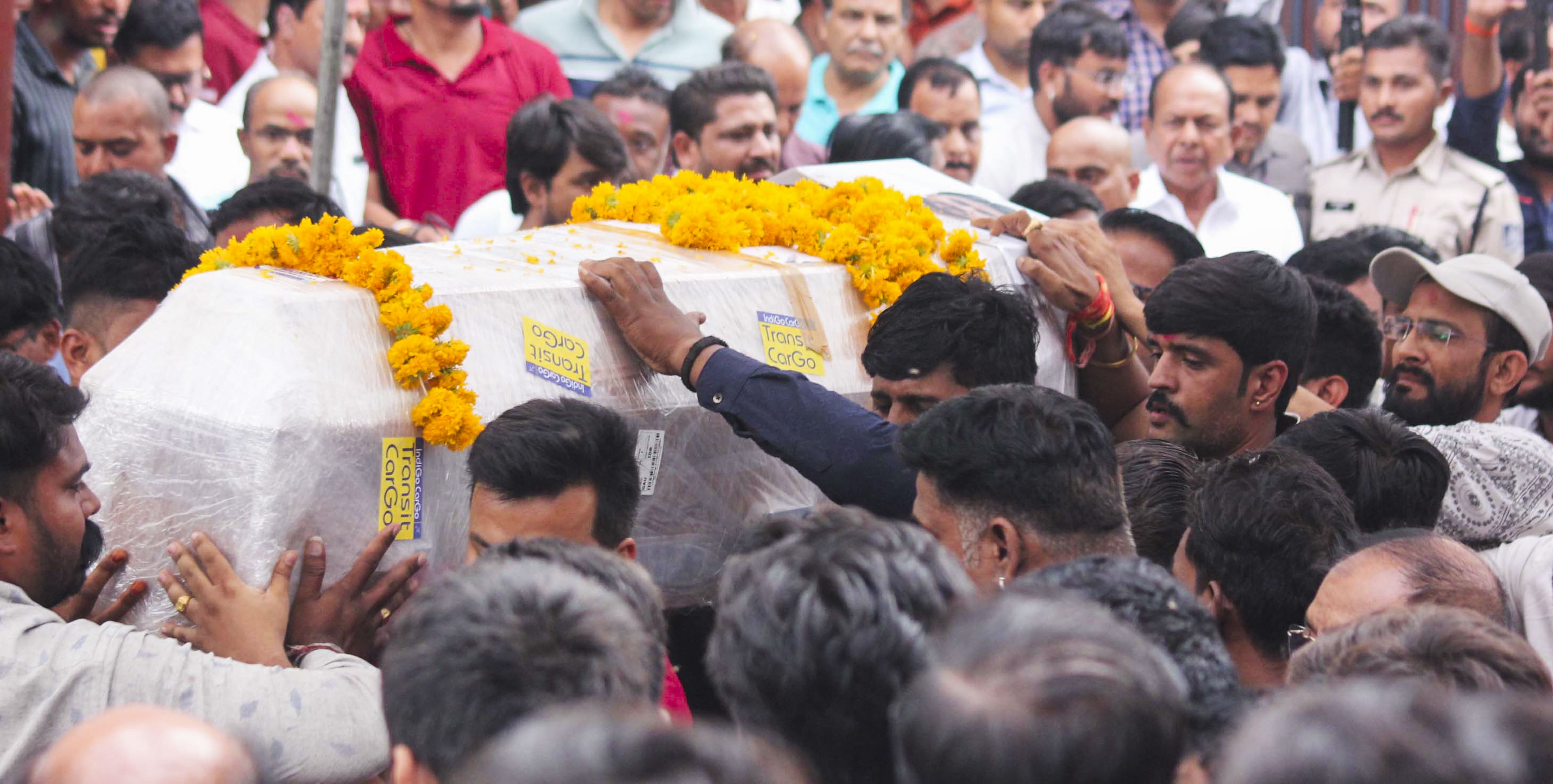 Indore: Relatives and family members attend the funeral of businessman Raja Raghuvanshi, who was found murdered days after he went missing with his wife in Meghalaya, in Indore, Wednesday, June 4, 2025. (Photo source: PTI)