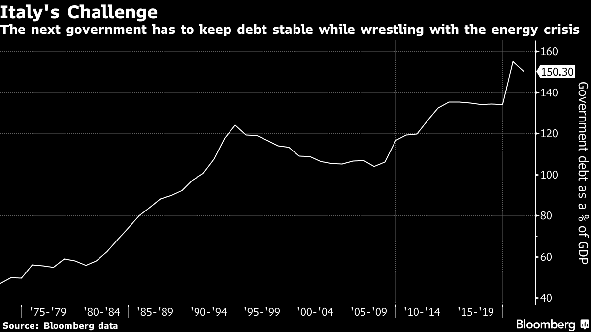 The next Italian government will face a series of overlapping crises as the energy shortages triggered by Russia's invasion of Ukraine fuel rampant inflation and undermine growth. The hit to Italy's finances and the prospect of more interest-rate hikes from the European Central Bank have pushed the yield on Italy's 10-year bonds to more than 4.3% compared with less than 1% in December.