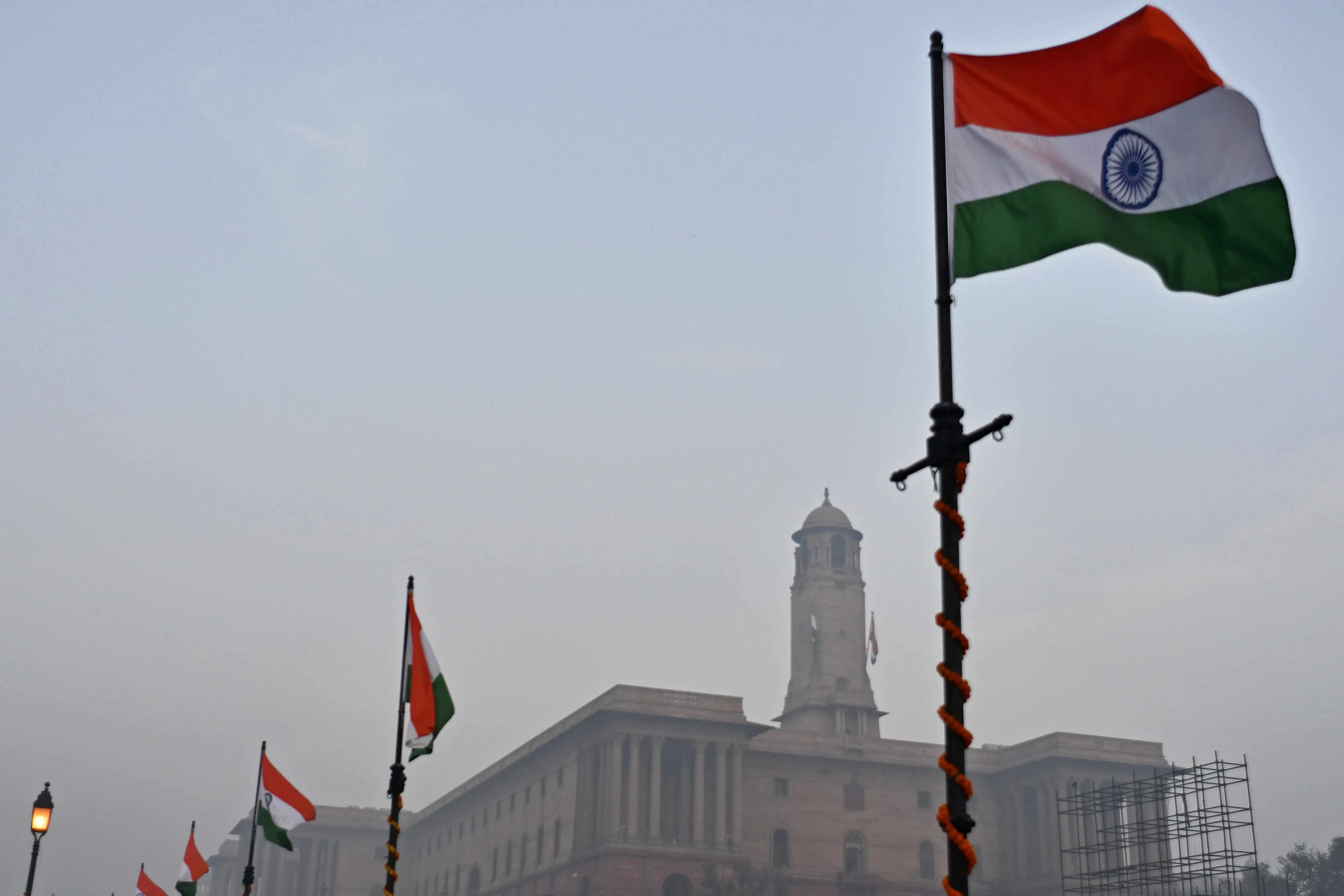 Indian national flags fly outside the North Block of the Central Secretariat buildings in New Delhi, India. (Photographer: Anindito Mukherjee/Bloomberg)