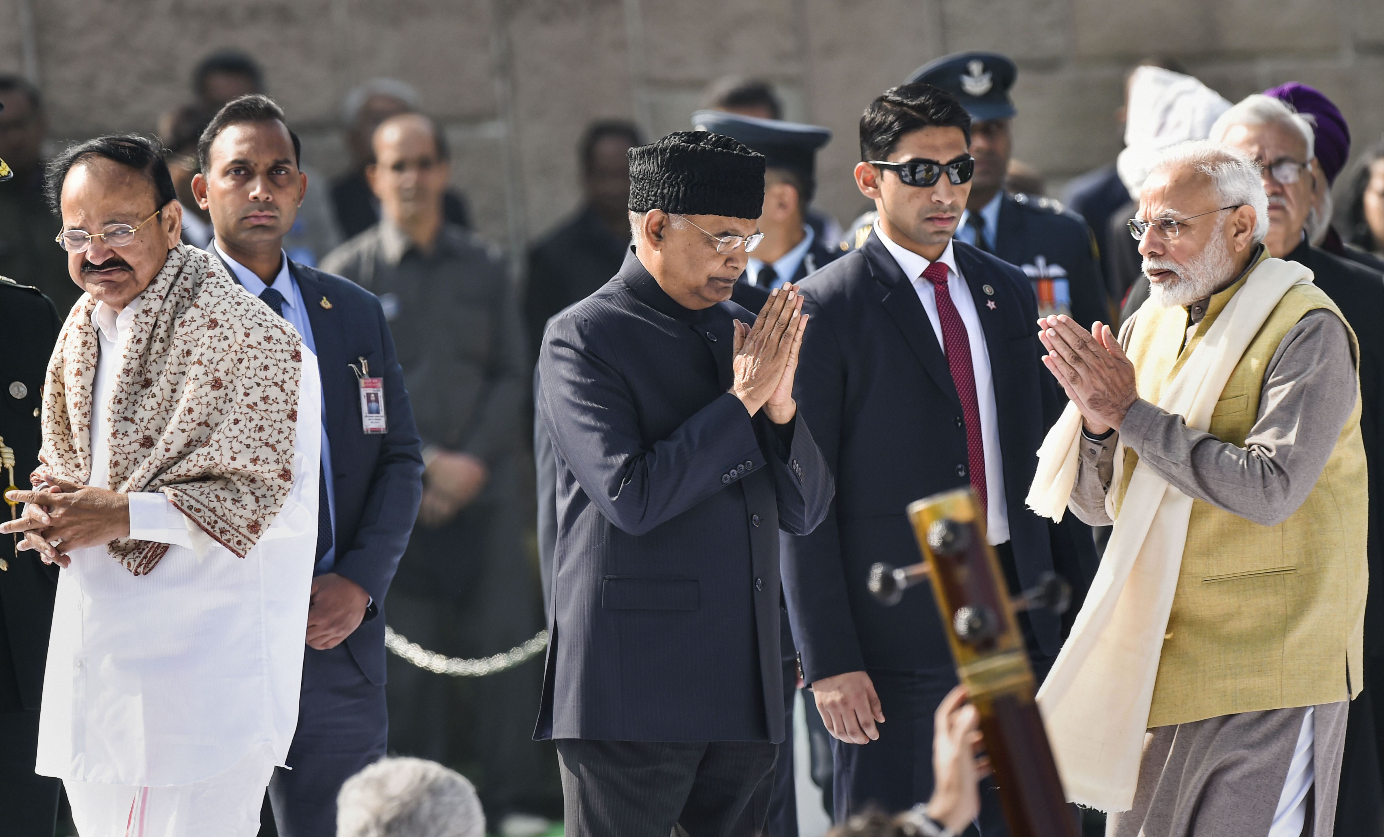 President Ram Nath Kovind is greeted by Prime Minister Narendra Modi during a tribute paying ceremony on the 72nd death anniversary of Mahatma Gandhi, also observed as Martyrs’ Day, at Rajghat in New Delhi. (Source: PTI)