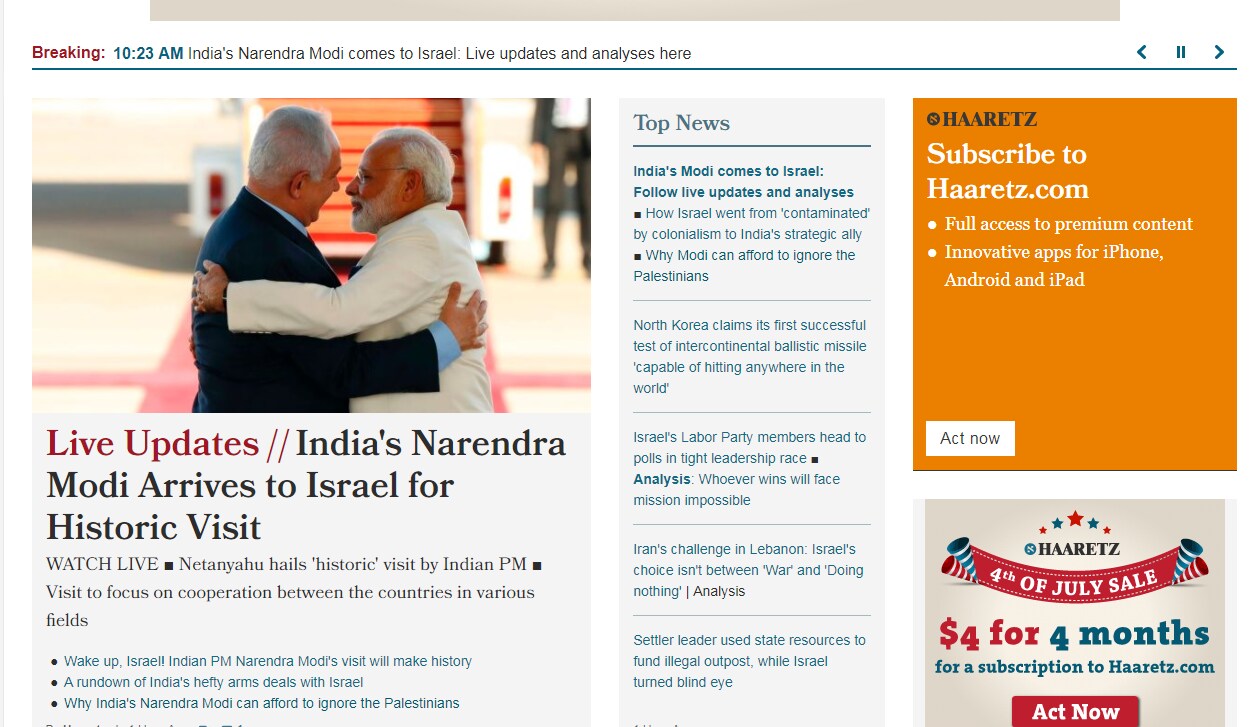 The top story on the English and Hebrew newspaper Haaretz.com is dedicated to the Modi-Netanyahu meet with live updates. An opinion piece on the website, titled, ‘Why India's Narendra Modi Can Afford to Ignore the Palestinians', says: