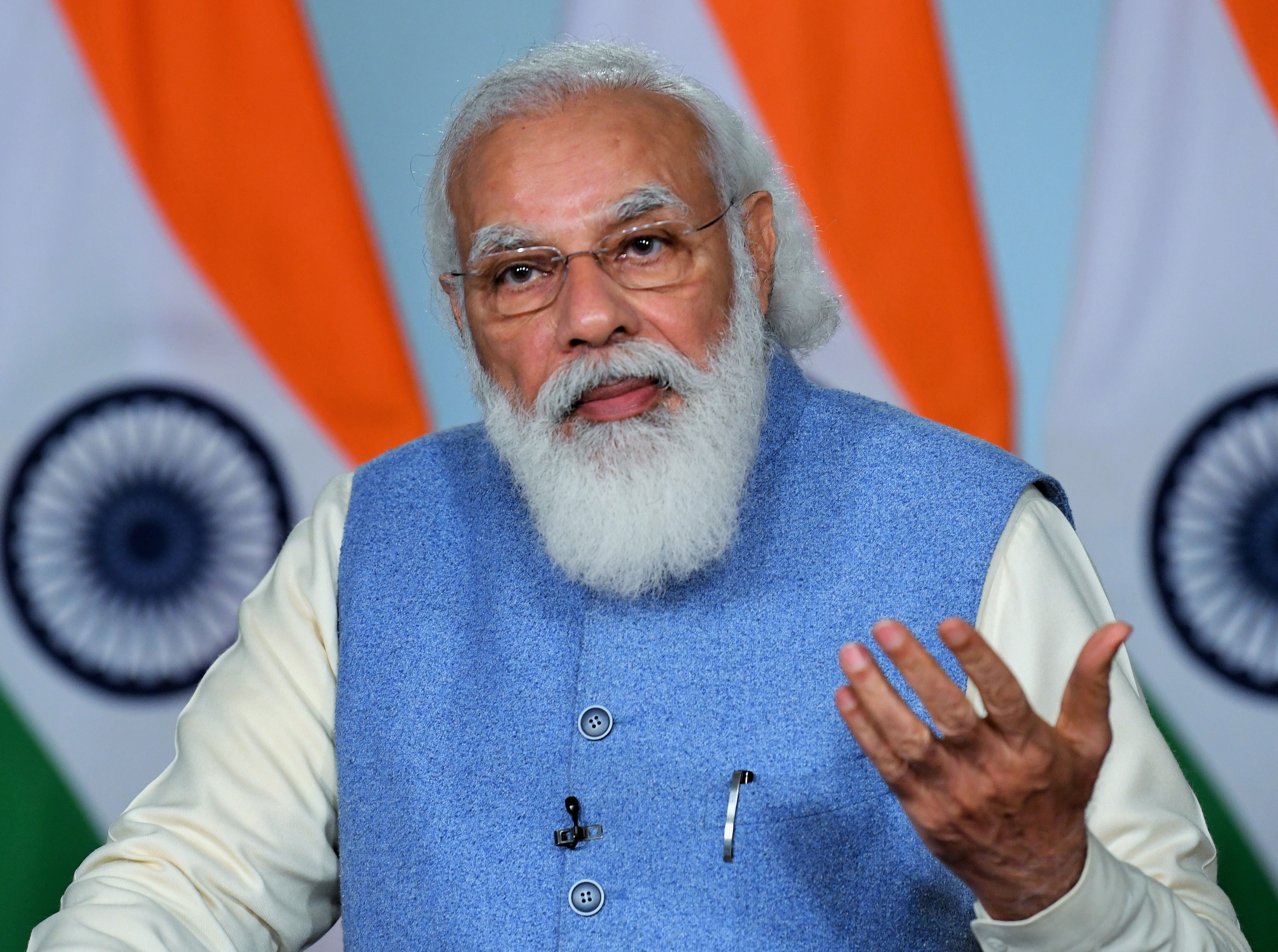 Prime Minister Narendra Modi gestures while speaking through video conference in New Delhi. (Photo: Press Information Bureau, Government of India)