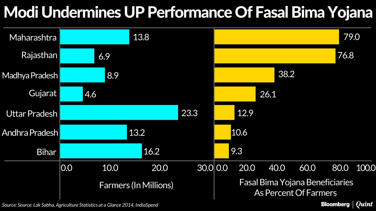 “Jahaan BJP ki sarkarein hai, chahe Gujarat ho, Maharashtra ho, Haryana ho, Rajasthan ho, Chhattisgarh ho, Jharkhand ho…wahaan 60-70% kisanonka (fayda) Pradhan Mantri Fasal Bima Yojana se ho chuka hai..aur Uttar Pradesh..sirf teen percent kisanonka bima hua” (In BJP-ruled states, about 60-70% farmers have benefitted from Pradhan Mantri Fasal Bima Yojana, while only 3% farmers in UP have been benefitted)