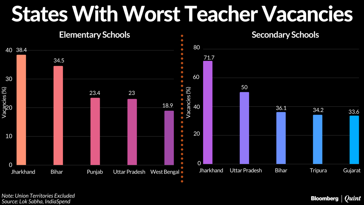 Teacher vacancy in UP is the second worst in India for secondary schools and sixth worst for elementary schools.