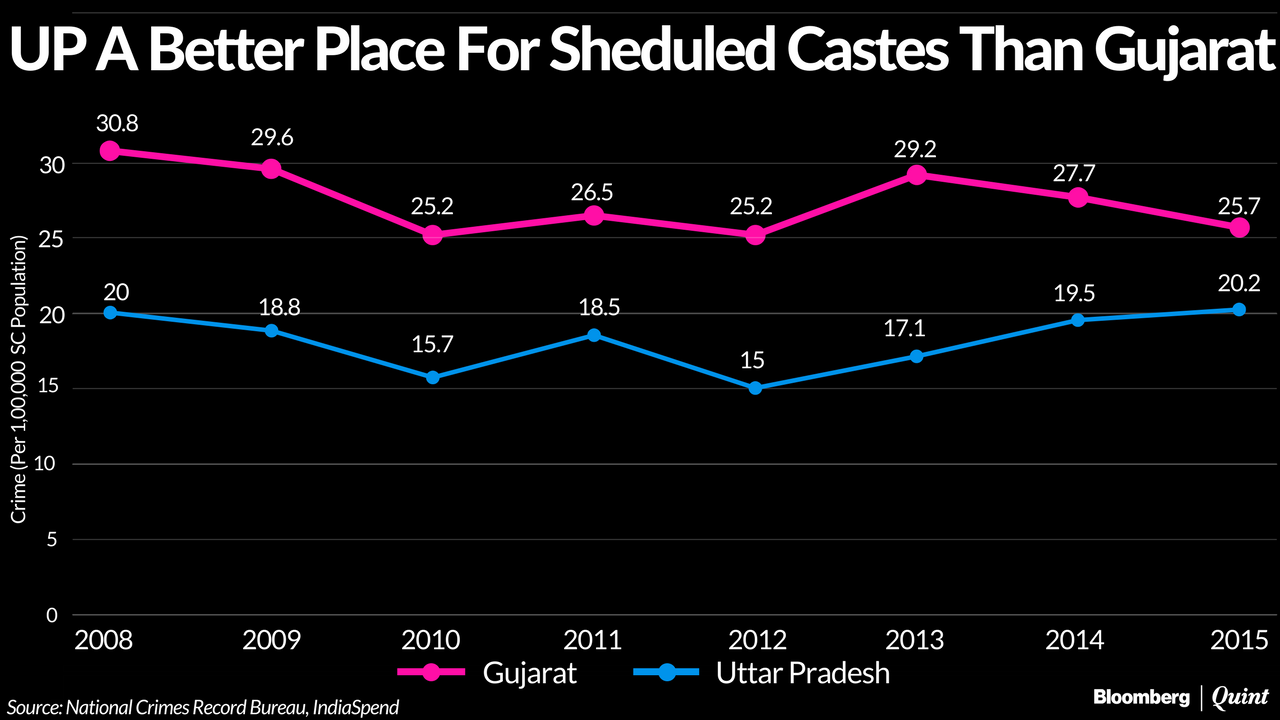 Though crimes against scheduled castes (SCs) were the highest in UP at 8,358 cases with 8,460 people affected in 2015, UP's crime rate, or crime per 100,000 SC population, was 20, less than Gujarat (26), Madhya Pradesh (37) and Goa (51), according to data from the National Crimes Records Bureau.