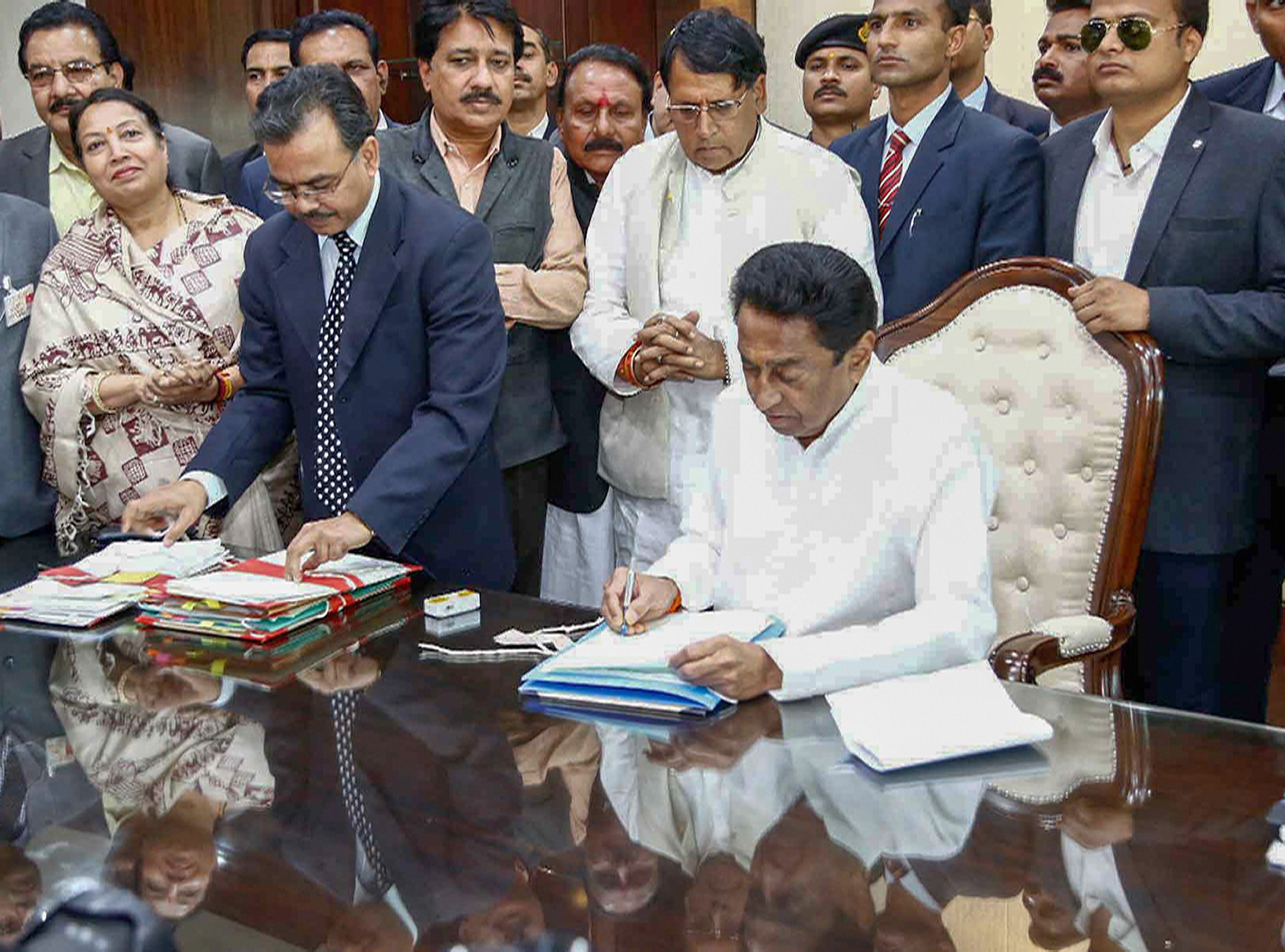 Madhya Pradesh Chief Minister Kamal Nath signs a file after assuming office. (PTI)