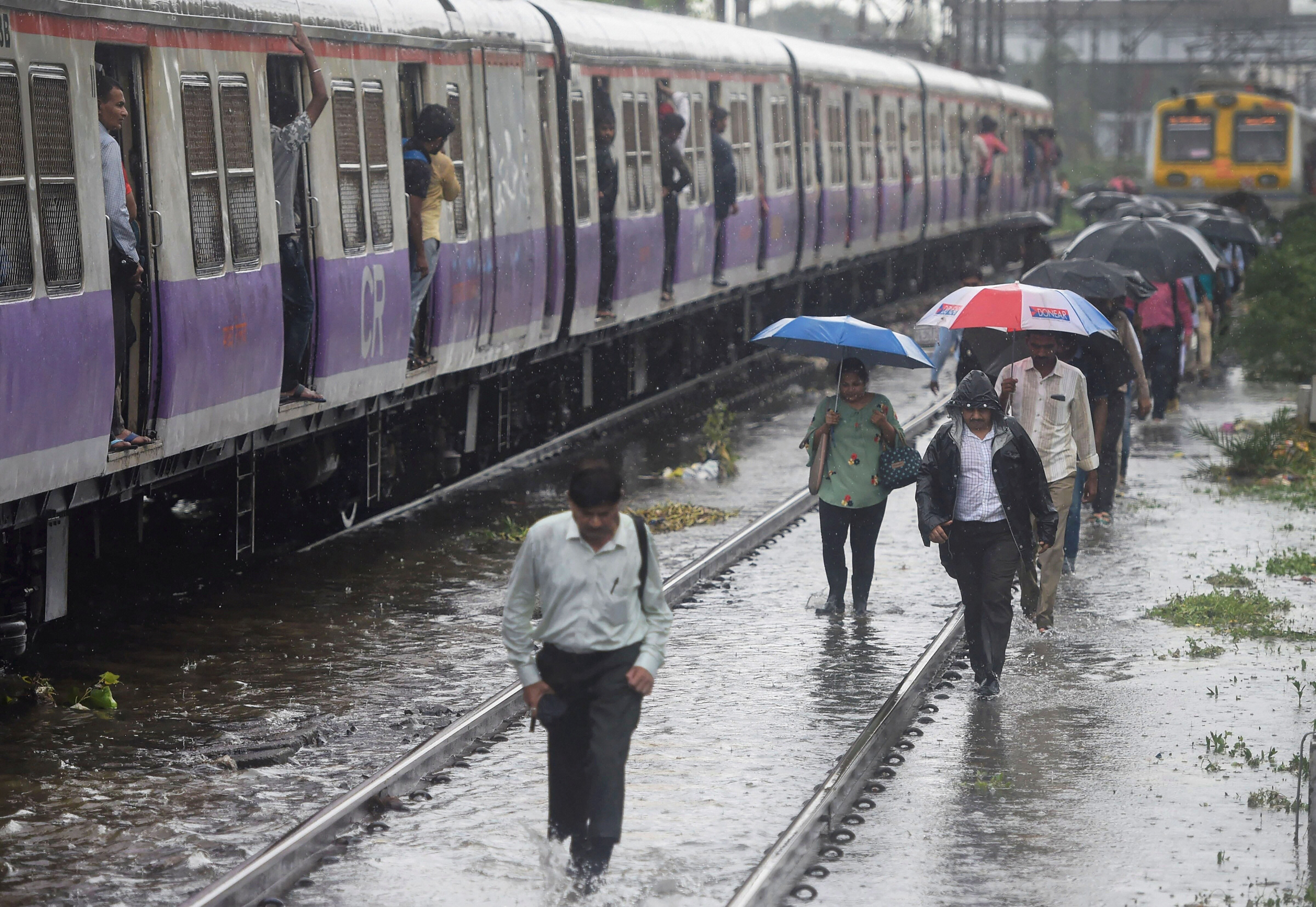Heavy rains continued to lash Mumbai on the second consecutive day on Monday, with some areas receiving up to 34 mm of rainfall in just one hour in the morning, affecting local train services during the rush hour between Kalyan and Thakurli stations of the Central Railway network.