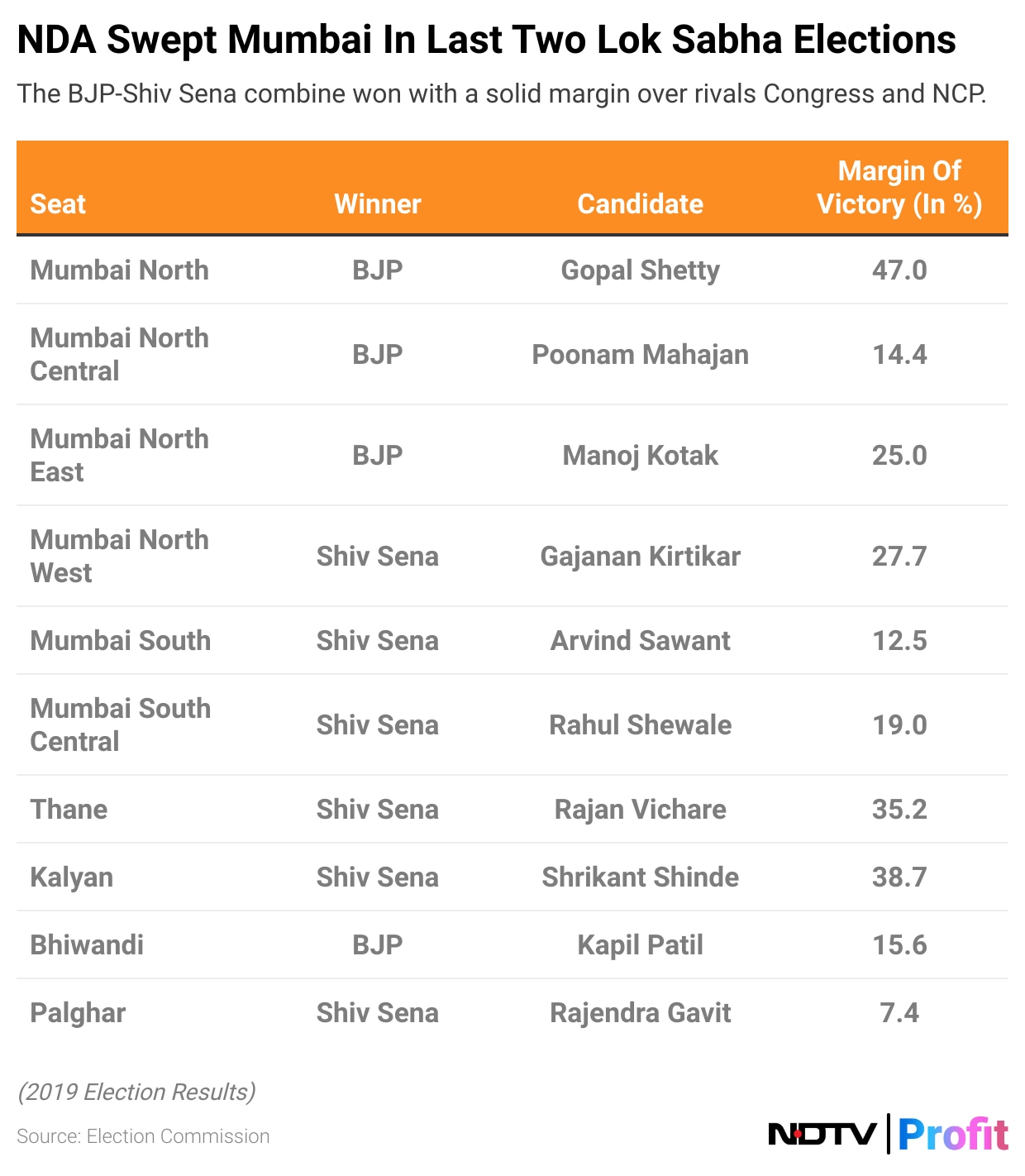 The NDA won 41 seats in both elections. It was a clean sweep for the saffron front in the Mumbai region. Both BJP (4) and Shiv Sena (6) bagged all seats contested.