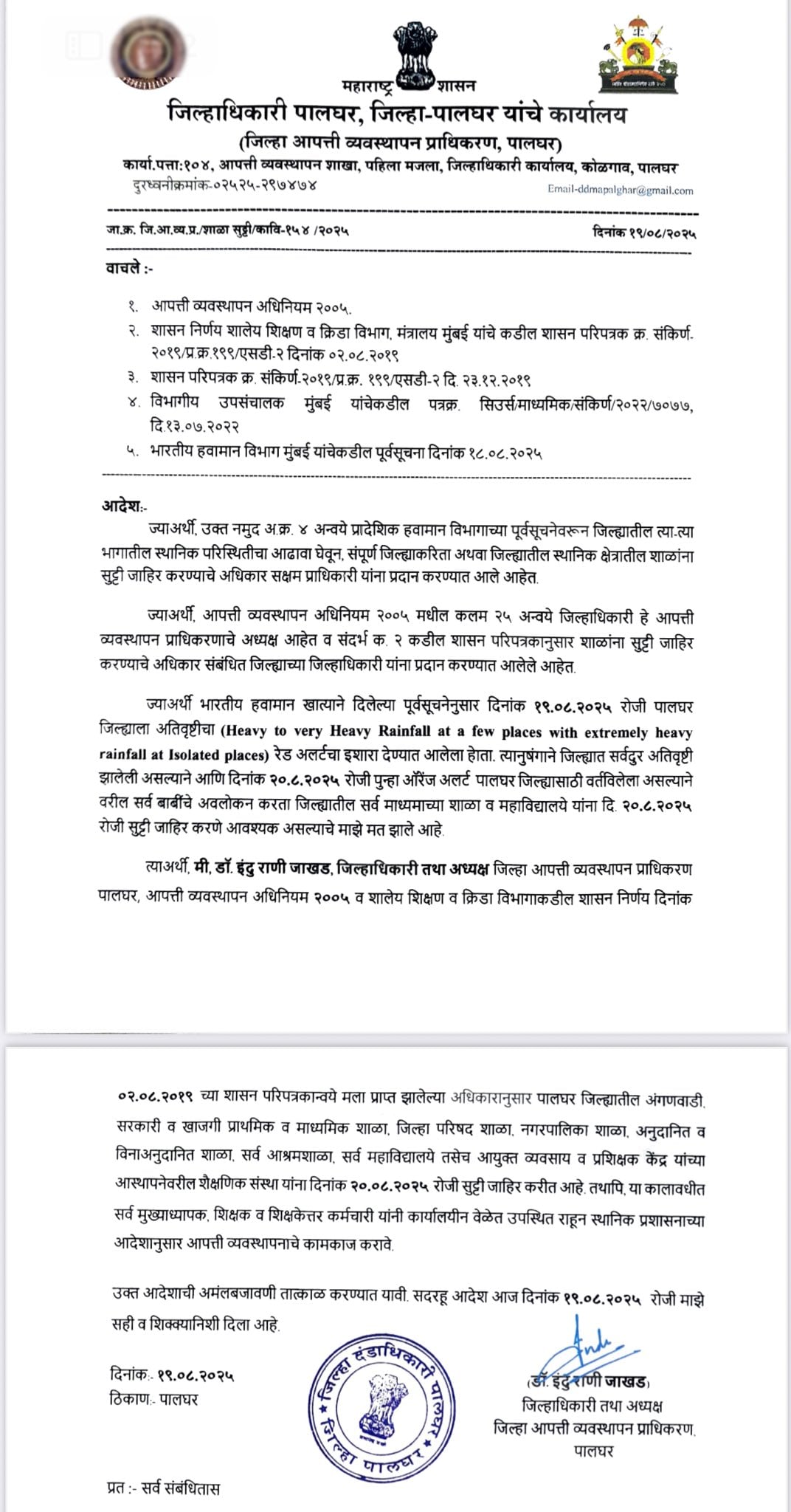 Schools and colleges, both public and private, will remain closed in Thane and Navi Mumbai on Wednesday (August 20) as southwest monsoon mayhem continues to disrupt normal life.