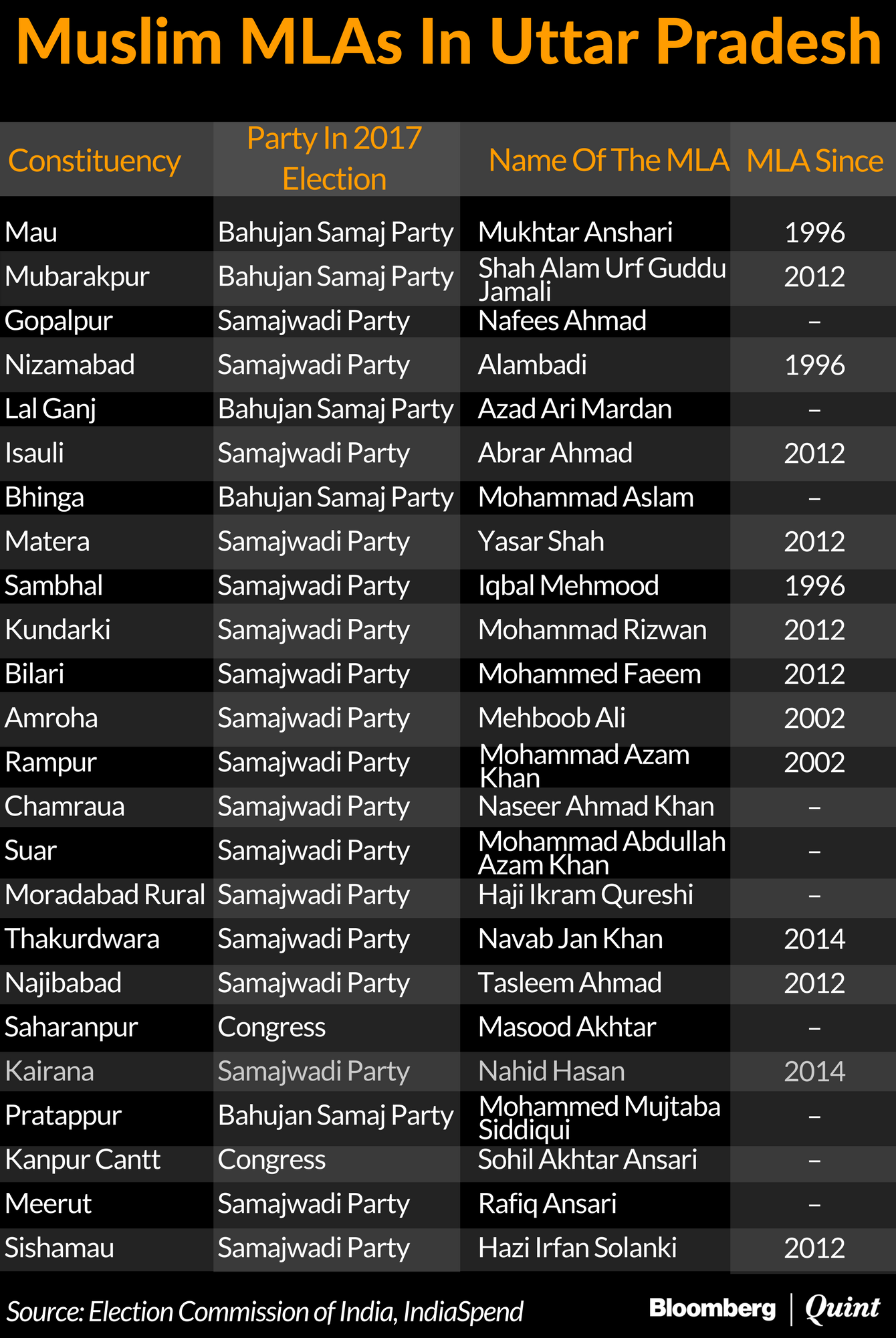 Muslim under-representation comes with the Bharatiya Janata Party (BJP)–the national ruling party–recording a sweeping victory across UP without fielding any Muslim candidate. The Muslim vote is a determining factor in 34 of 80 Lok Sabha constituencies, and in 130 of 403 assembly constituencies, according to political scientist Giles Verniers in this 2014 report for The Hindu Centre For Politics and Public Policy, a think tank.