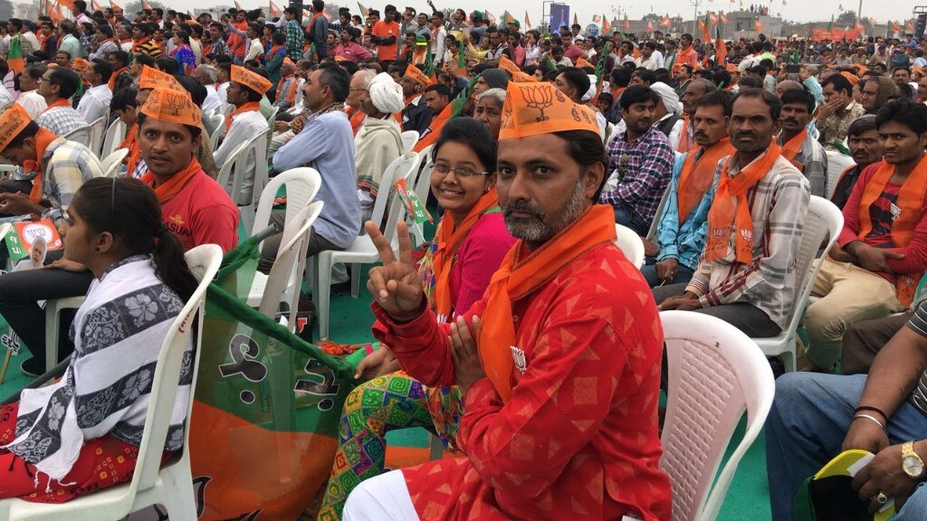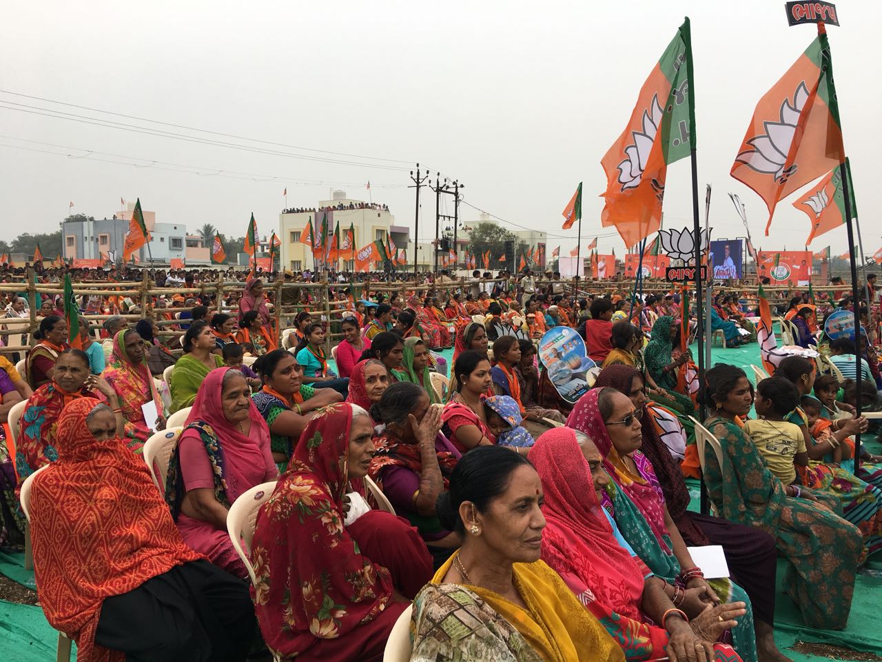 In anticipation of a smaller crowd, the BJP organisers held the rally at Bhavnagar on Monday in a small ground although much larger grounds were available. However, villagers crammed in trucks and tractors were ushered in and the ground filled up in no time.