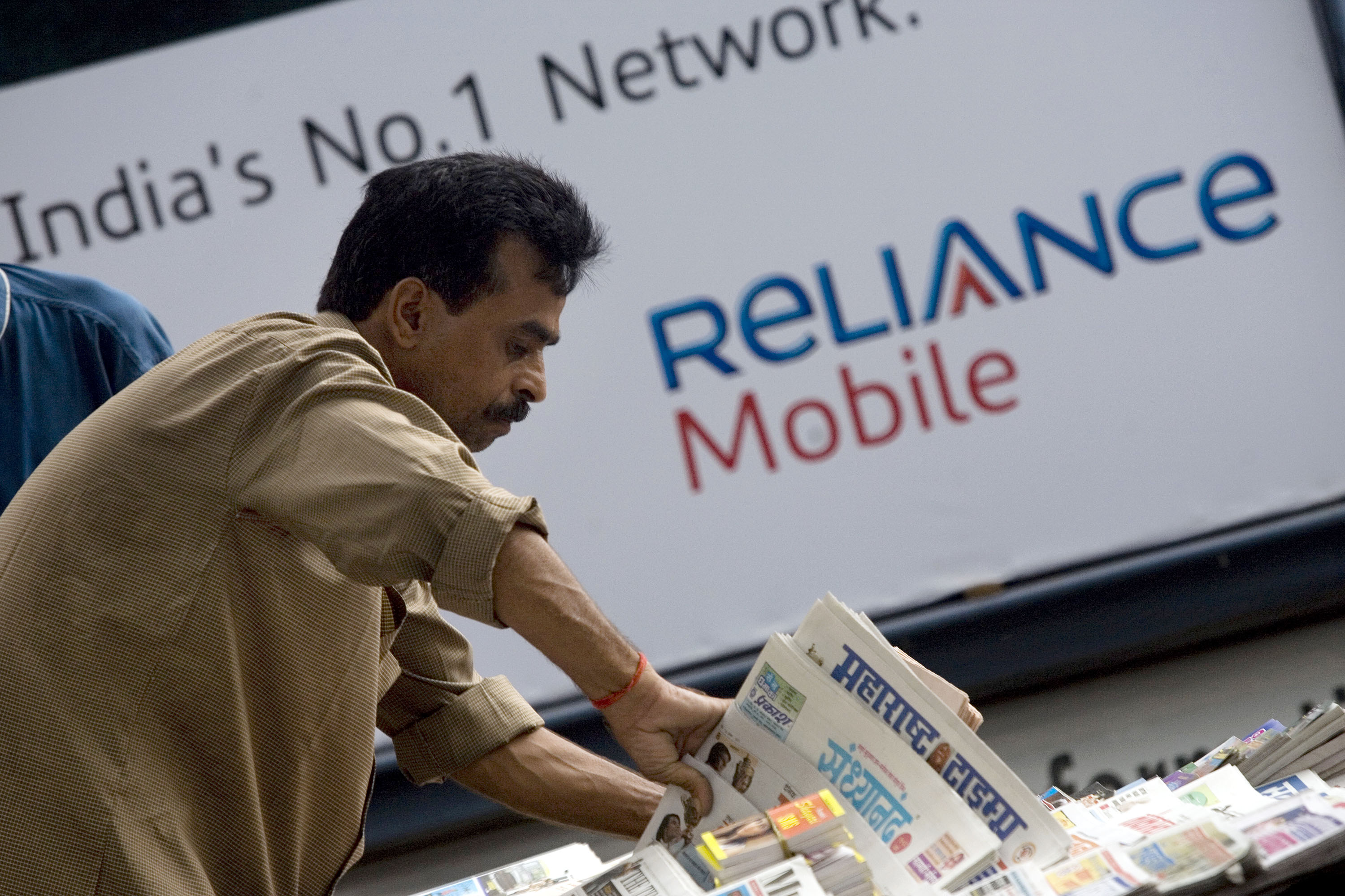 A newspaper vendor arranges his papers in a stall next to a Reliance Communications Reliance Telecom street kiosk, in Mumbai. (Photographer: Prashanth Vishwanathan/Bloomberg News)