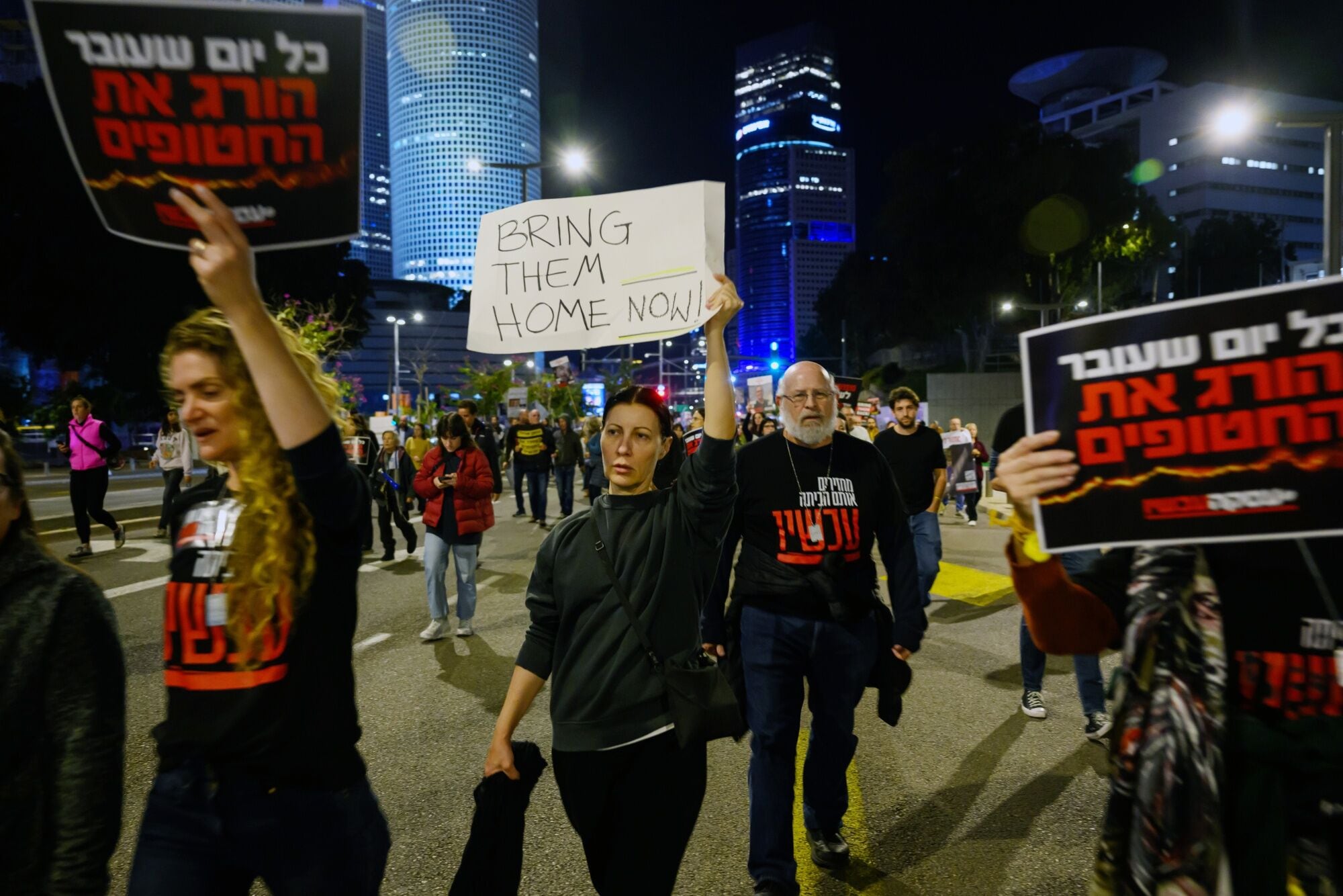 Protesters march through the streets after demonstrating outside the Israel Defense Force headquarters on December 15, 2023 in Tel Aviv, Israel. (Photo by Alexi J. Rosenfeld/Getty Images)