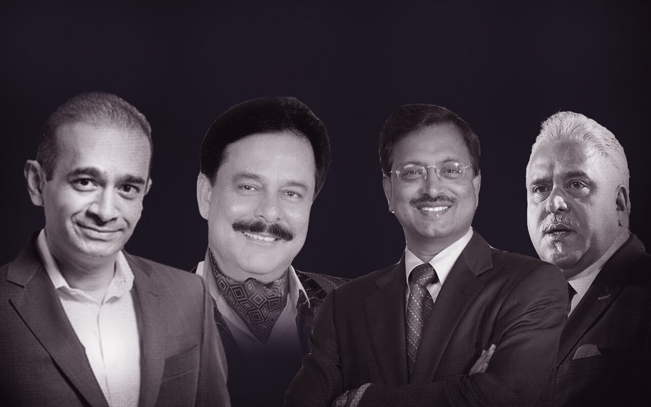 From left: Nirav Modi, Subrata Roy, Ramalinga Raju and Vijay Mallya. (Image: BloombergQuint)