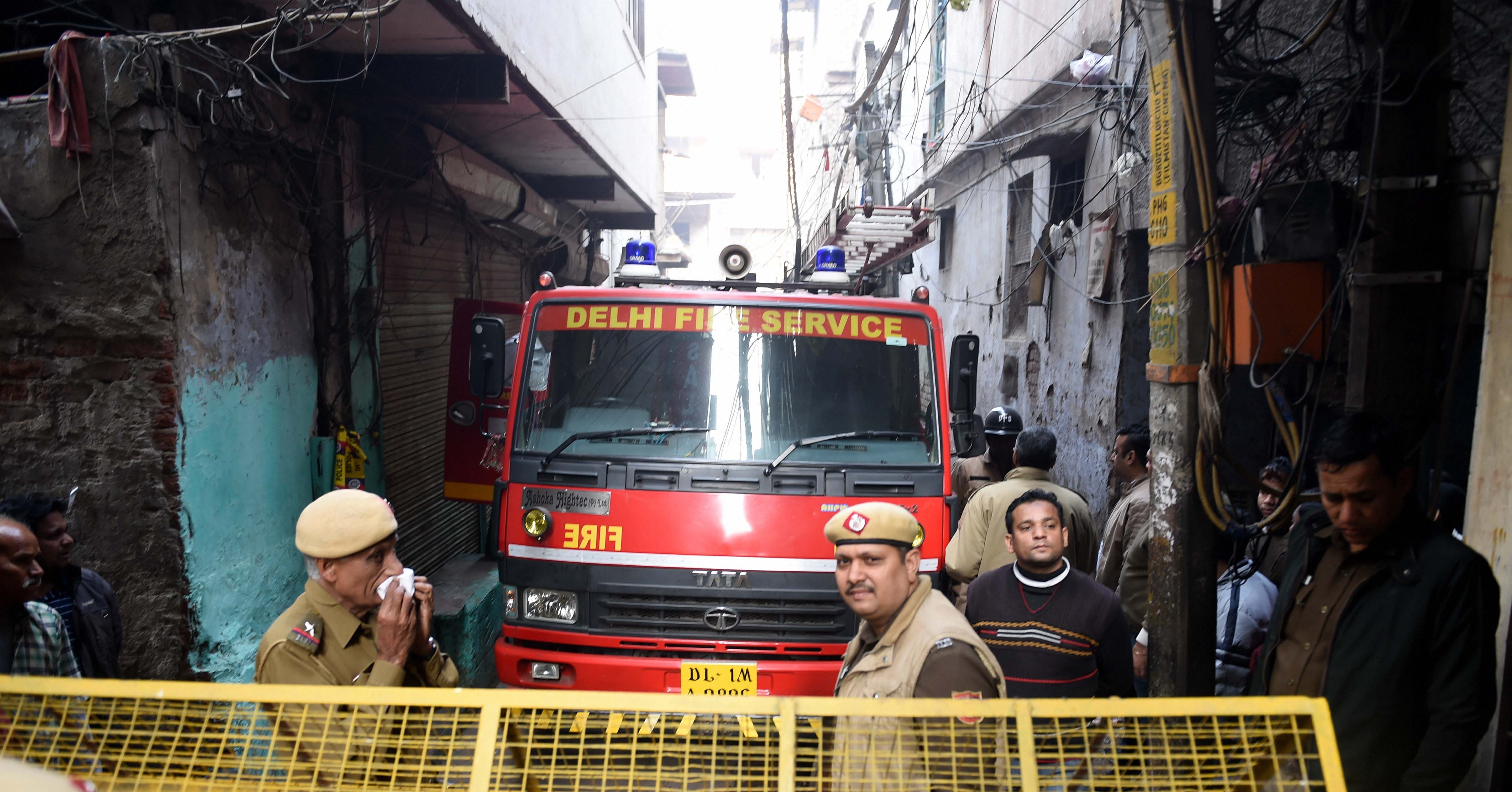 Fire tenders arrive at a spot where a minor fire broke out in the same factory building in Anaj Mandi in New Delhi. (Source: PTI)