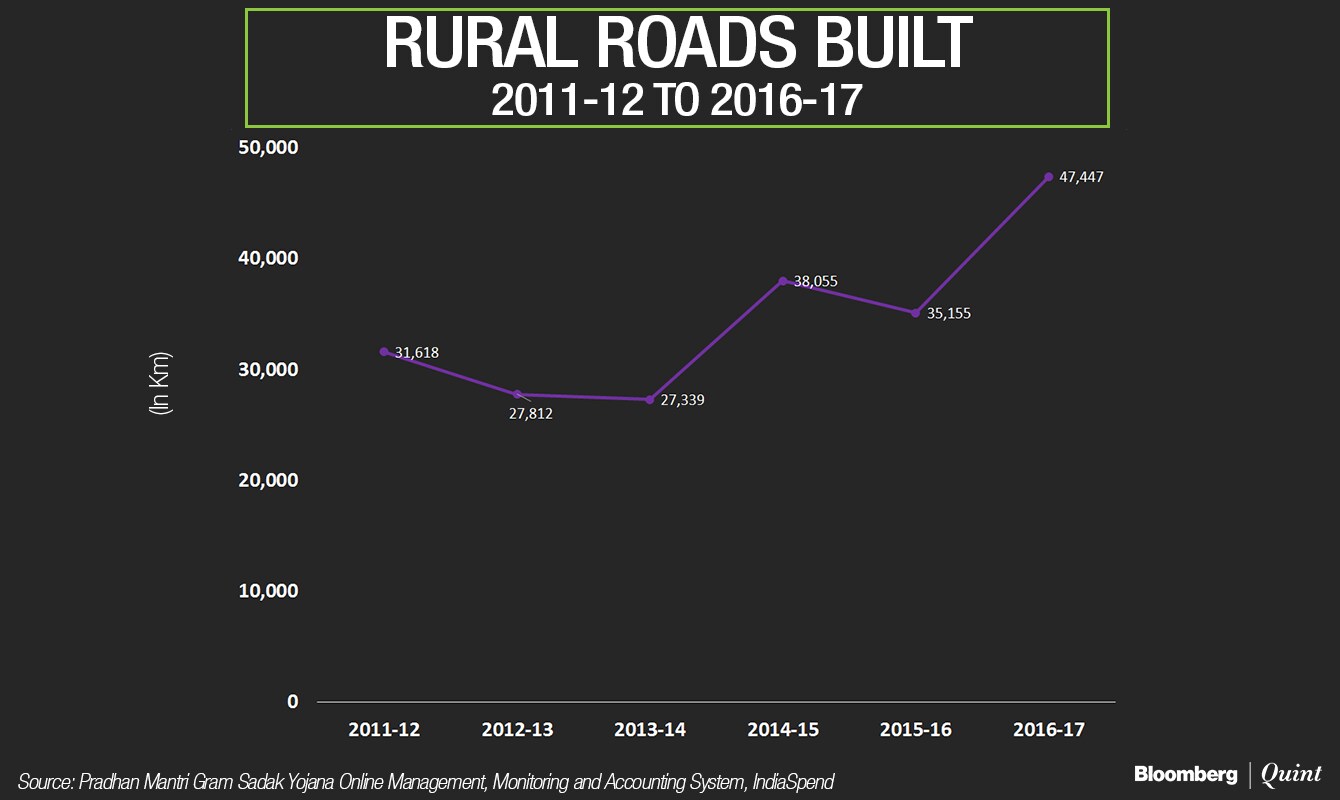 The Modi government built 1,20,000 km rural roads between 2014-15 and 2016-17 under the Pradhan Mantri Gram Sadak Yojana (Prime Minister's Rural Roads Scheme) as against 86,770 km built under the Singh government between 2011-12 and 2013-14, according to official data.