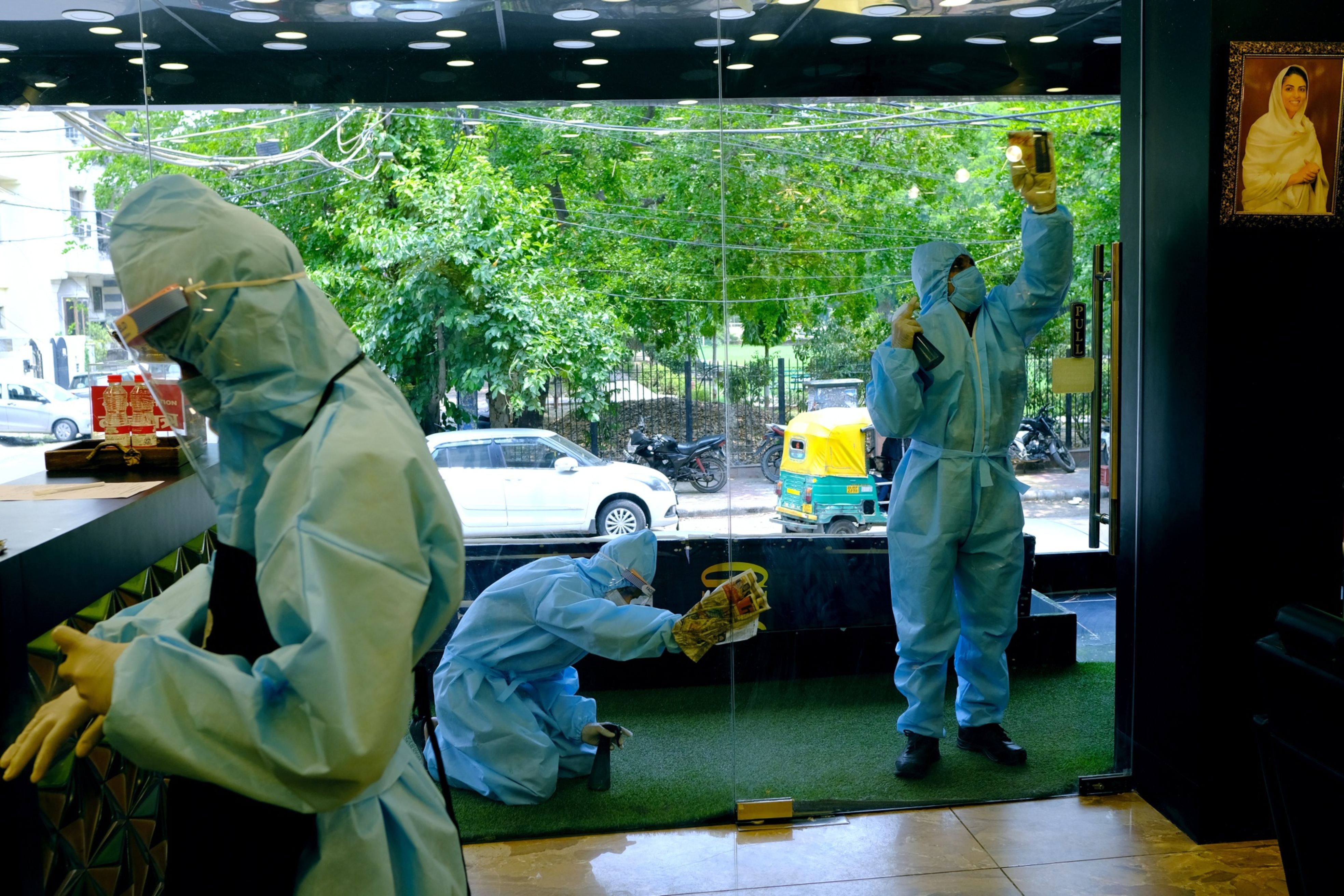 Hairdressers wearing personal protective clothing disinfect the entrance of a salon in New Delhi, India. (Photographer: T. Narayan/Bloomberg)