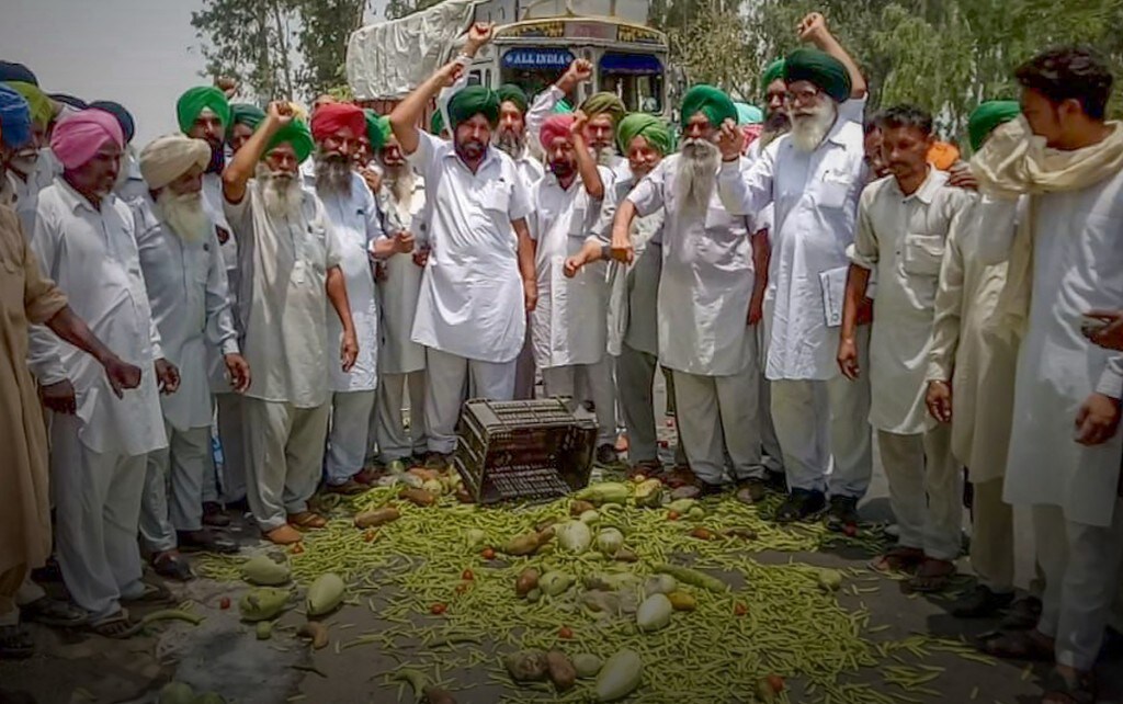 Farmers throw vegetables on a road during state-wide protests, at Bagha Purana in Moga district of Punjab. (Photo: PTI)