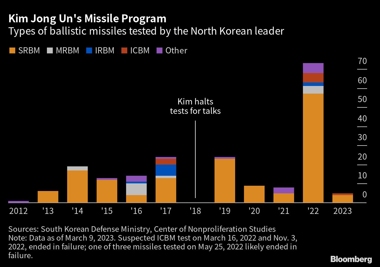(Bloomberg) -- North Korean leader Kim Jong Un presided over live-fire drills where his military launched several suspected short-range ballistic missiles after his sister threatened the US with consequences if it goes ahead with joint exercises with South Korea.