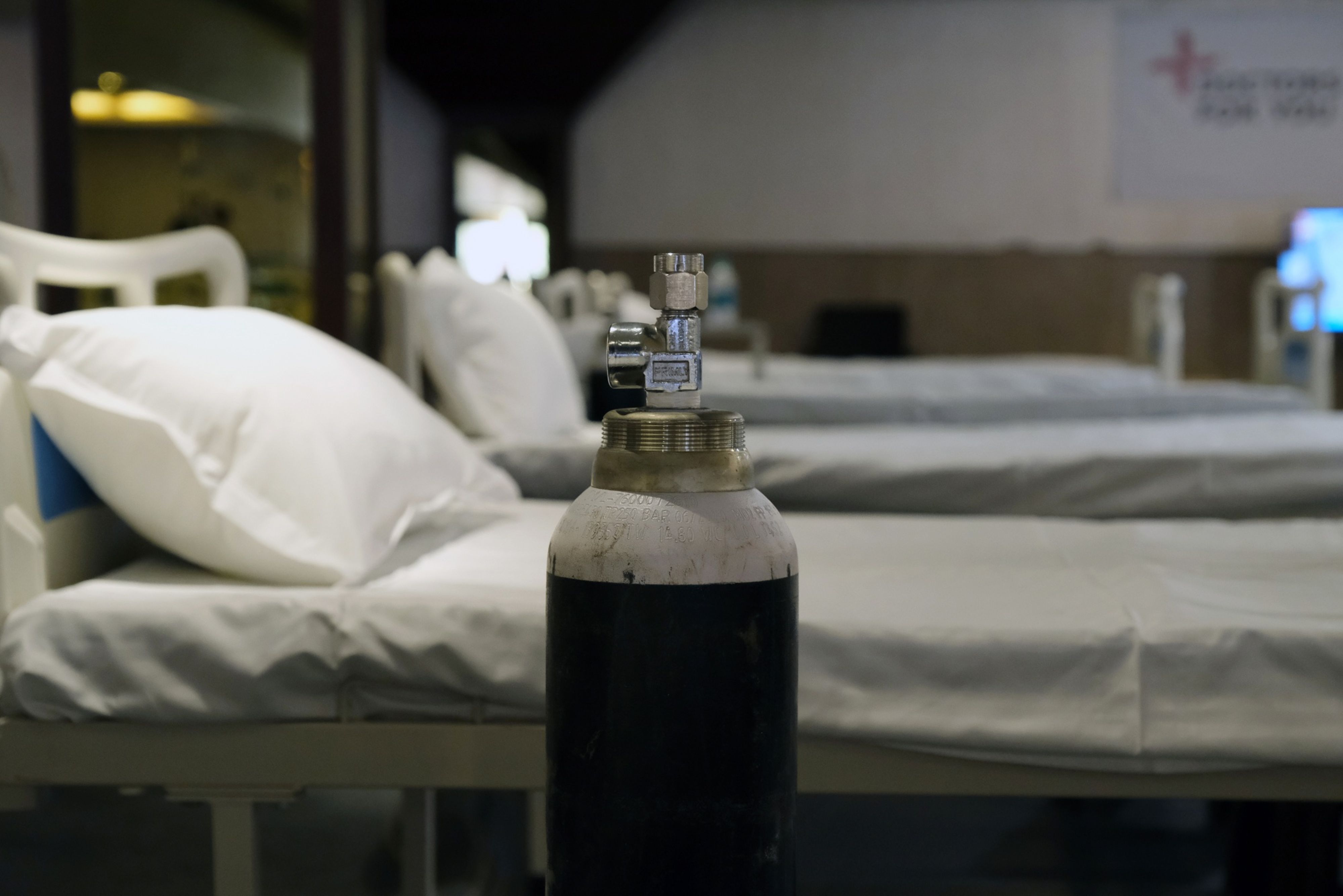 An oxygen cylinder sits next to a bed in a makeshift hospital ward in New Delhi, on June 24, 2020. (Photographer T. Narayan/Bloomberg)