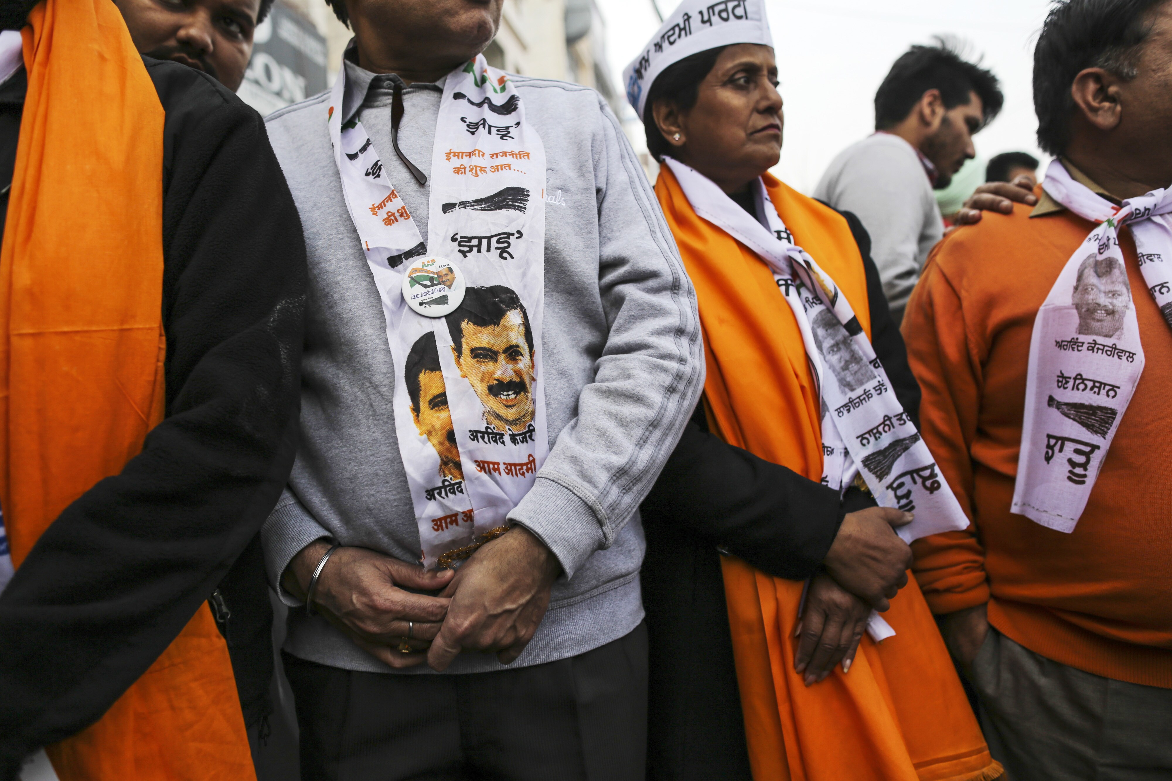 Supporters of the Aam Aadmi Party (AAP) wear scarves featuring images of Arvind Kejriwal, leader of the AAP and chief minister of Delhi, during a state election rally in Amritsar, Punjab, India. (Photographer: Dhiraj Singh/Bloomberg)
