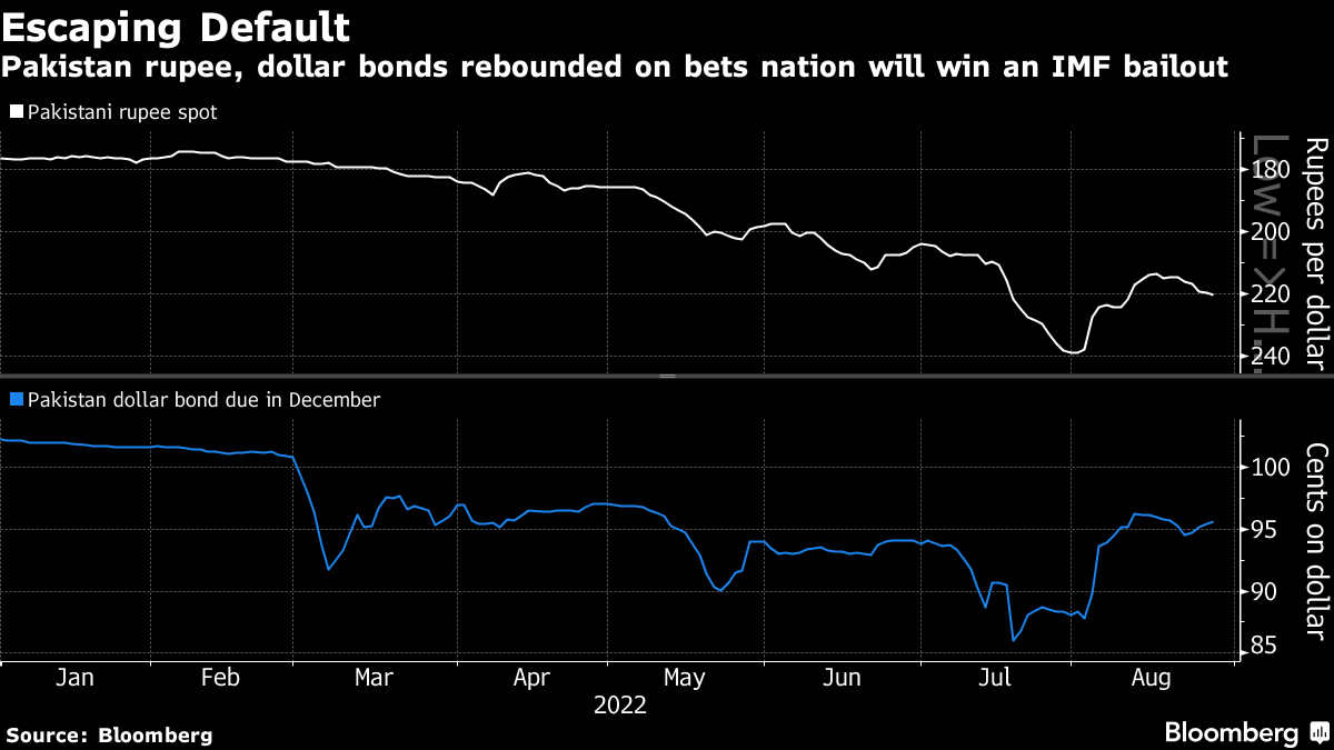 The mixed performance in Pakistan's dollar bonds underscore the nation's rocky path ahead. Notes due in December were indicated at about 94 cents on the dollar on Friday from a low of 85 cents in July, as investors grow more confident the debt will be repaid. Meanwhile, bonds due in 2031 were still quoted at below 60 cents on the dollar in distressed territory.