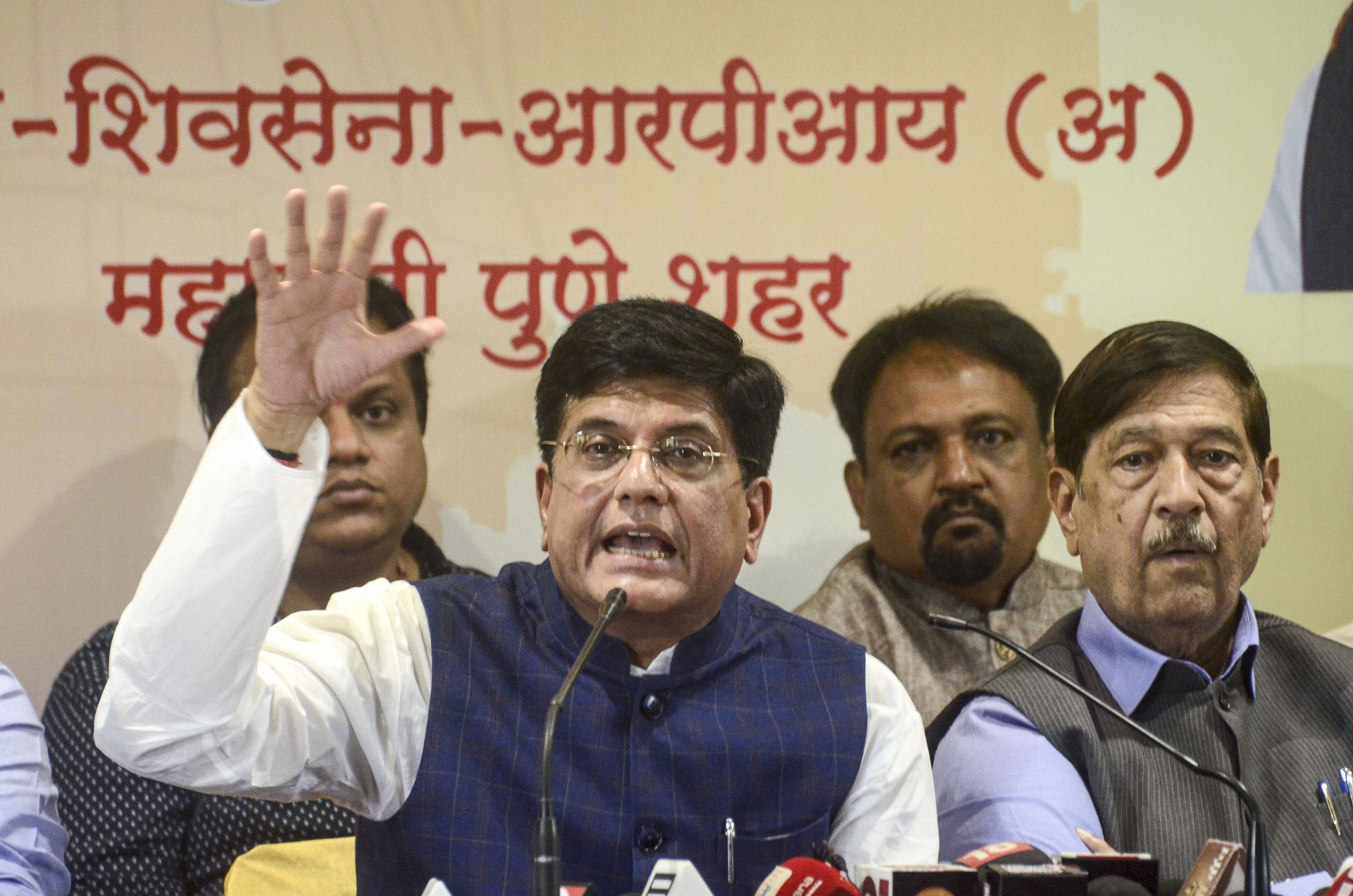 Union Minister Piyush Goyal addresses a press conference in Pune on Friday. (Photo: PTI)